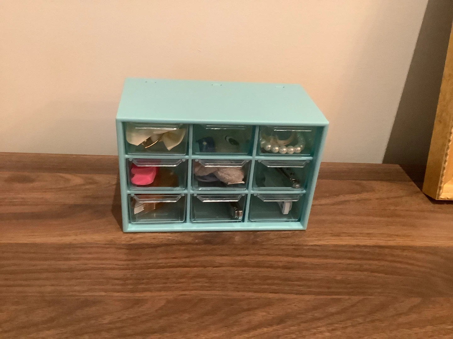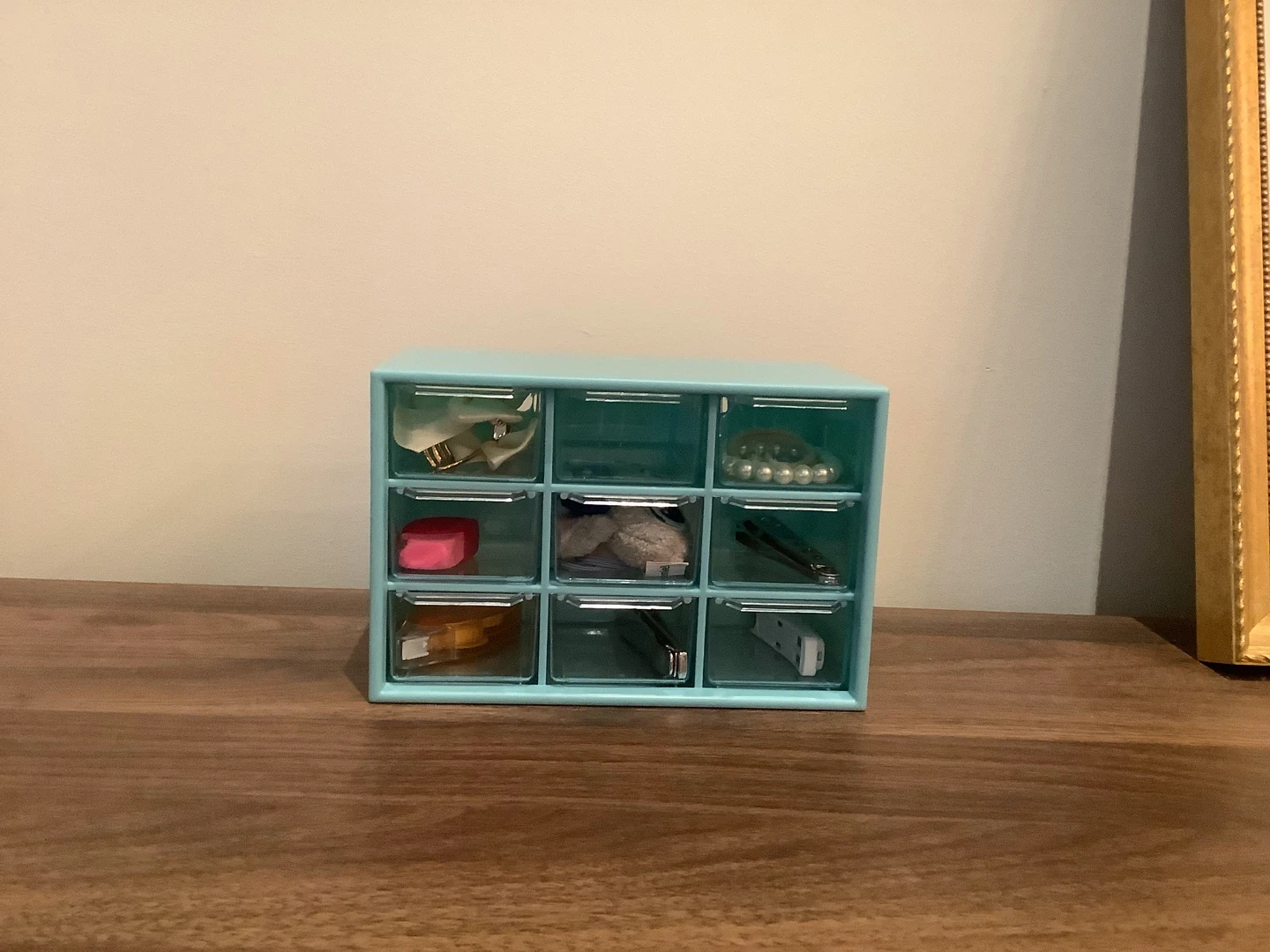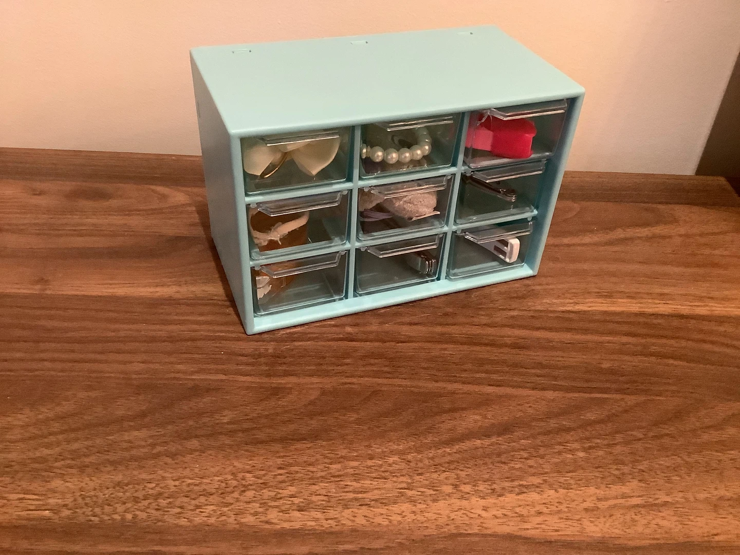 This light blue organizer has nine clear drawers, perfect for small items. Plastic material. It's great for keeping craft supplies or jewelry tidy. This would be useful for anyone needing extra storage. Easy to access and great for desktop storage.