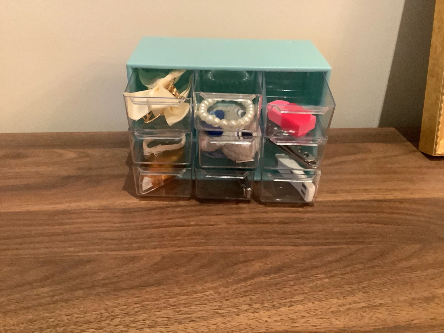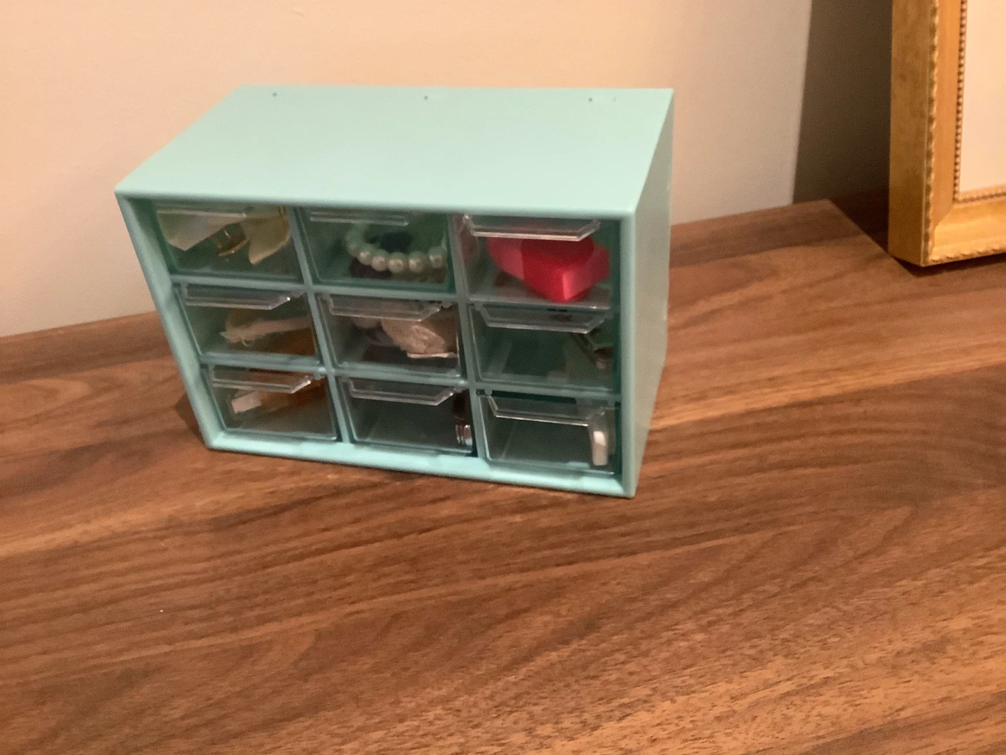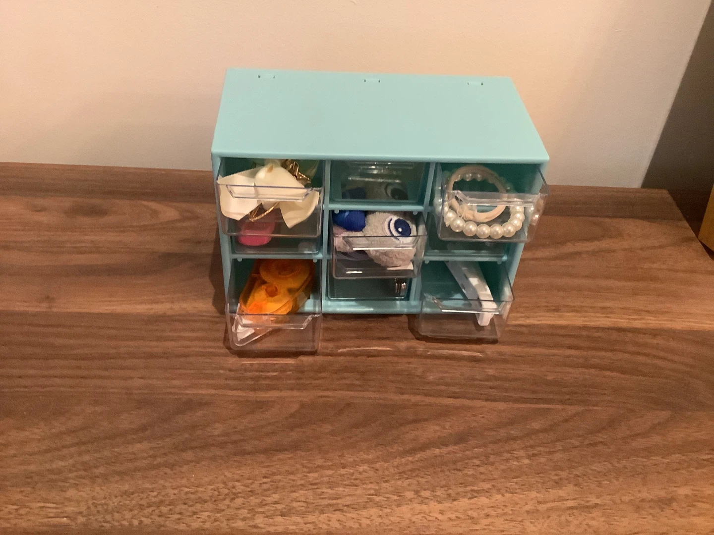 This light blue organizer has nine clear drawers, perfect for small items. Plastic material. It's great for keeping craft supplies or jewelry tidy. This would be useful for anyone needing extra storage. Easy to access and great for desktop storage.