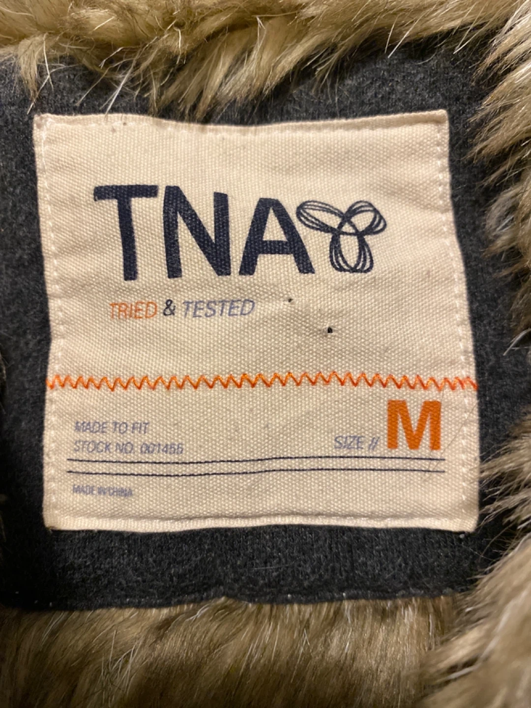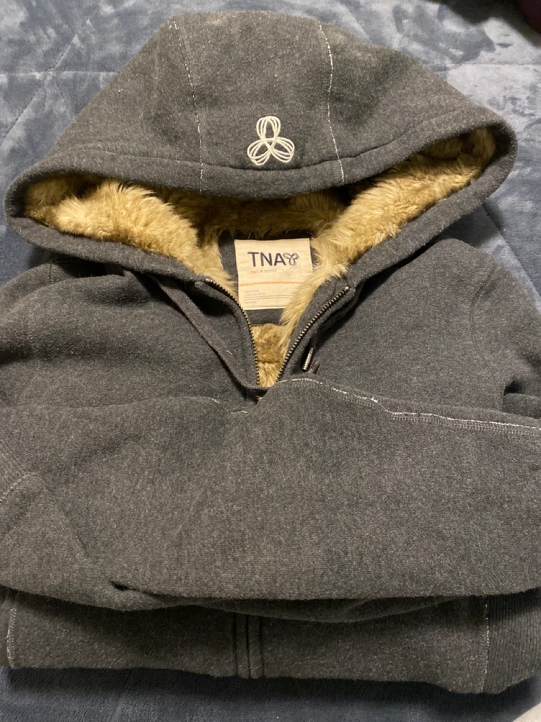 This TNA hoodie features a cozy, fur-lined hood and is a size medium. It's made with a soft grey fabric and has a full zip closure. Perfect for staying warm on chilly days!