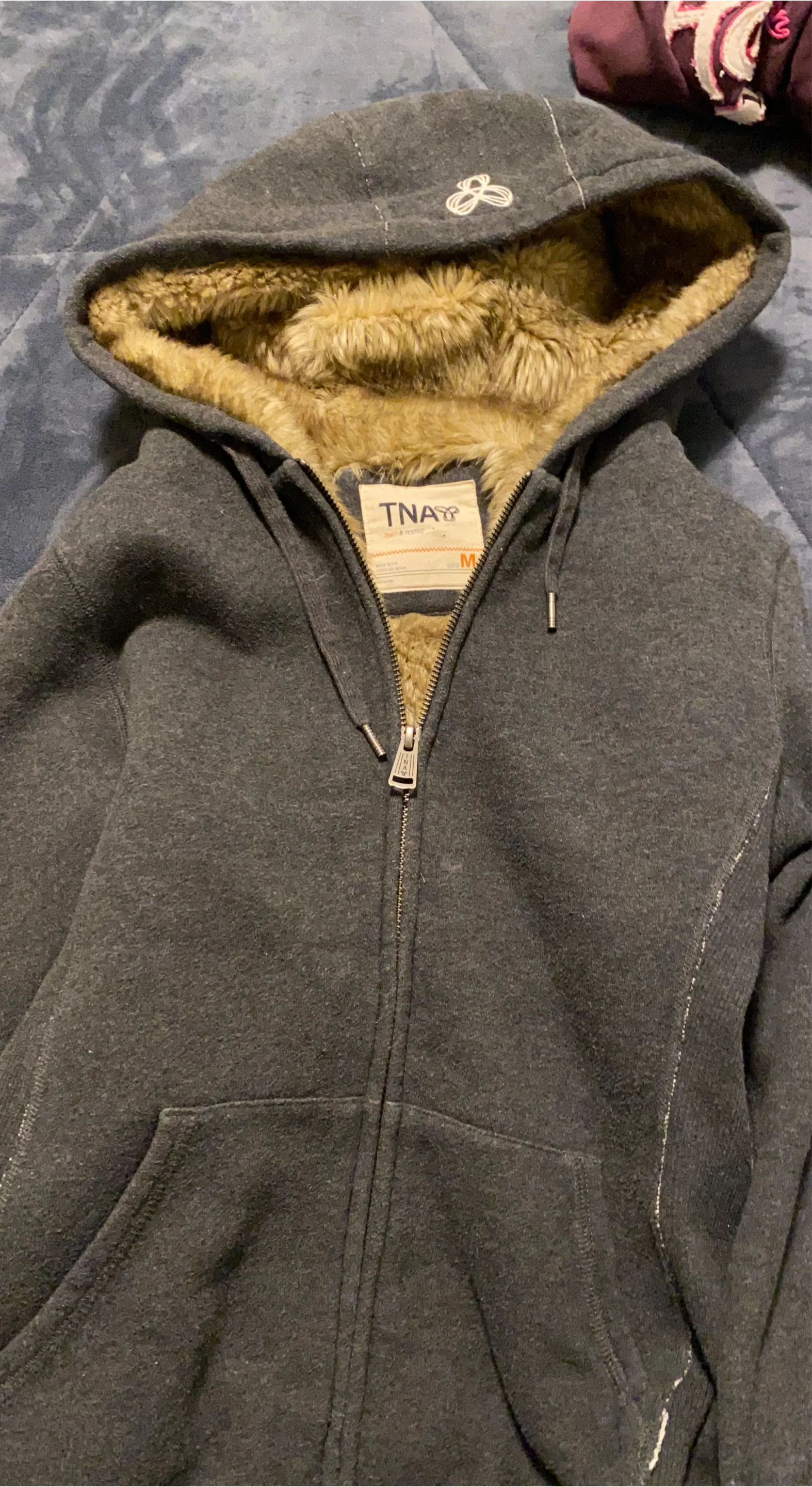This TNA hoodie features a cozy, fur-lined hood and is a size medium. It's made with a soft grey fabric and has a full zip closure. Perfect for staying warm on chilly days!