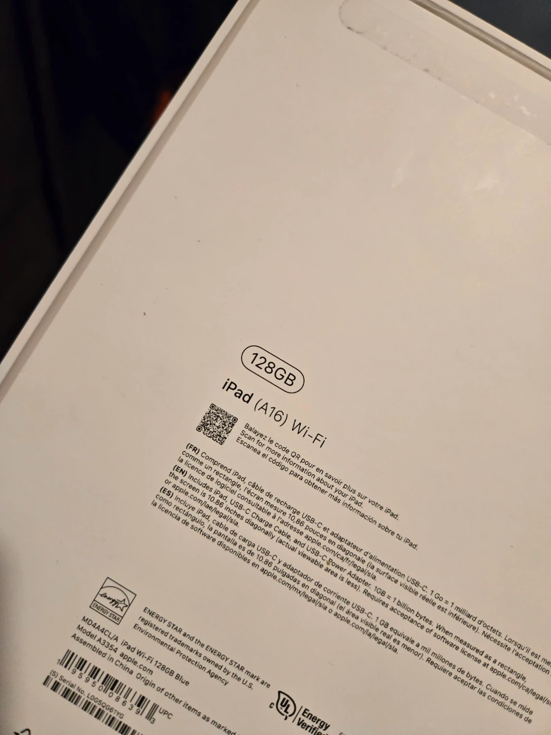This is a blue Apple iPad A16 Chip Wifi with 128Gs It's in its original box and includes the original charger and USB-C cable.