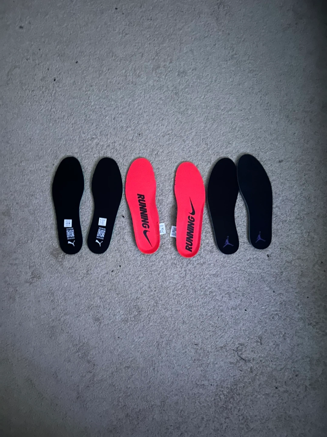 Set of six athletic insoles featuring Nike running insoles, Jordan insoles, and Puma insoles. Various styles for different sports activities.