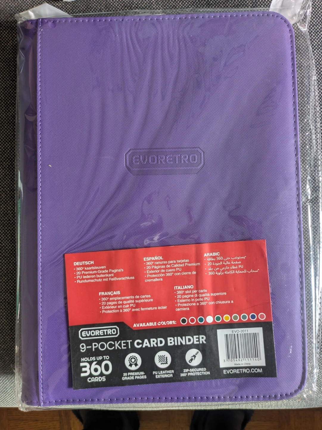 Fits 360 cards total, each slot is about 7 cm wide x 9.5 cm high. Zipper is pretty good, goes all the way around the outside, and the cover is plastic so it should hold up to a bit of water. Taken out of the package but never used.