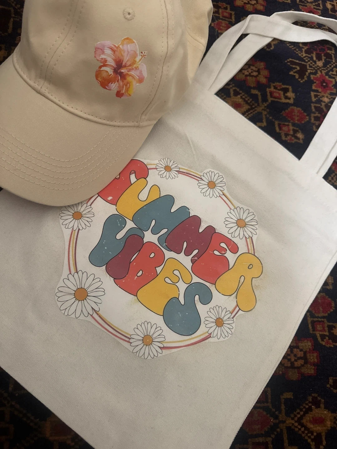 I have a cute tote bag with a 'Summer Vibes' design and a matching cap with a floral design for sale! Both are in great condition and ready for summer outings