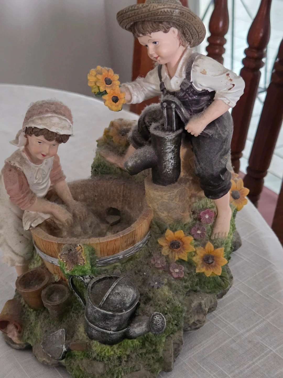 A charming figurine depicting a boy and girl tending to a garden. It features a wooden tub, watering can, and sunflowers. This piece adds a touch of rustic charm to any decor.