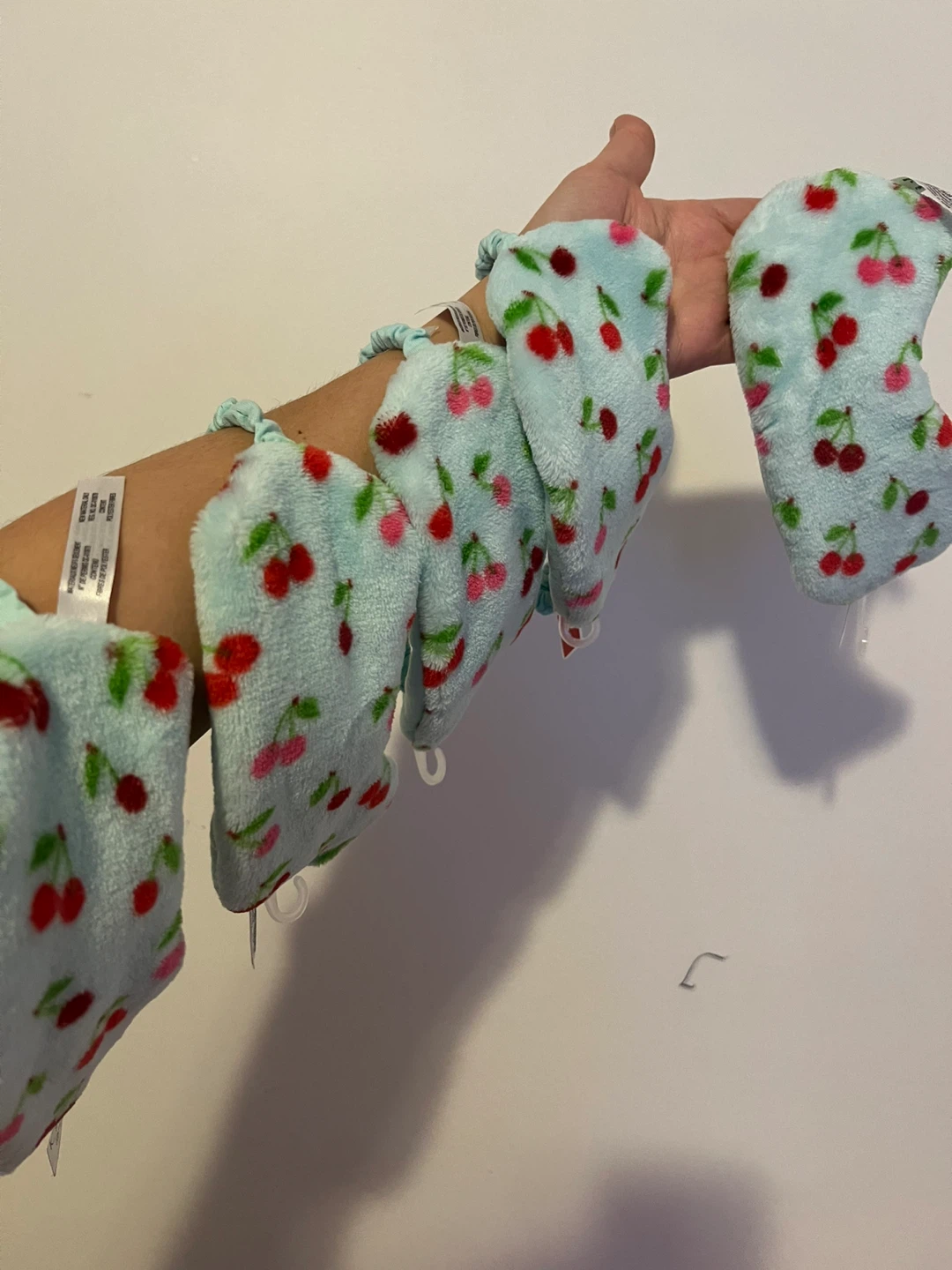 Cozy light blue plush set with a fun cherry pattern. Includes a stretchy headband and a matching scrunchie. Soft material for comfortable wear! $3 each