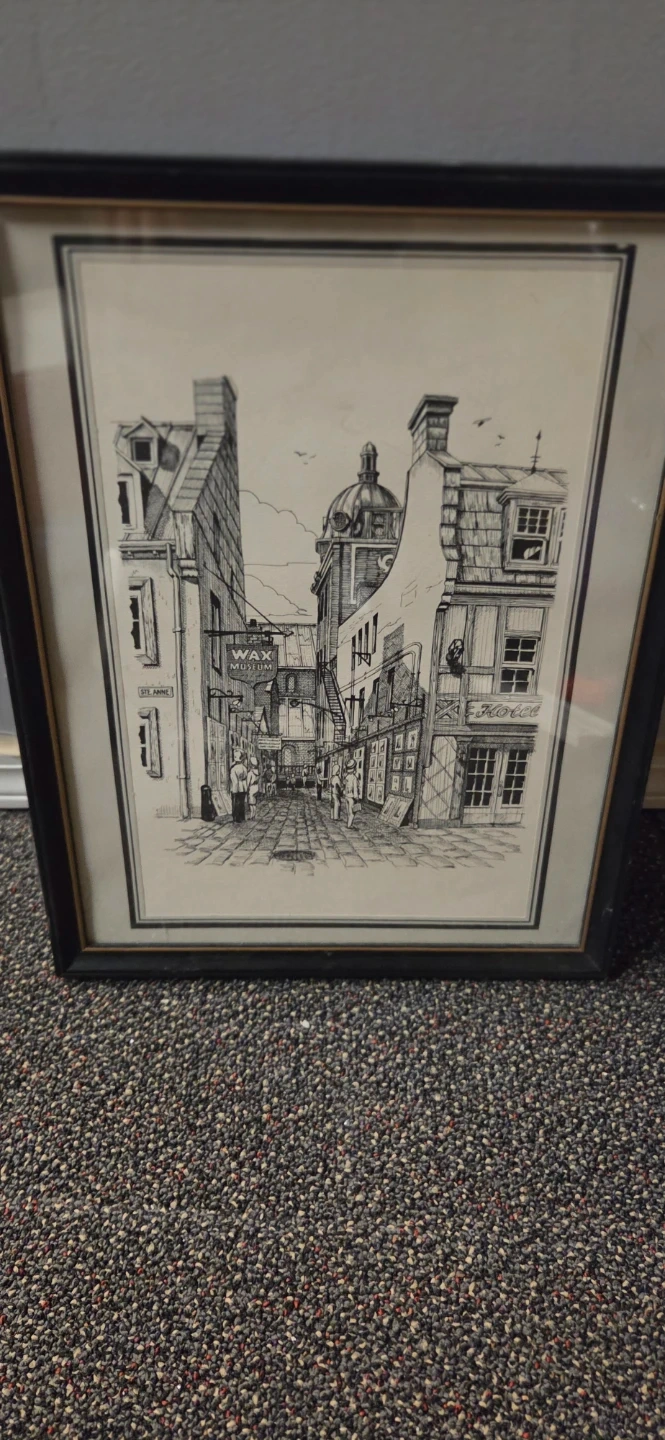 A framed pen and ink drawing depicts a charming European street with buildings, people, and a sign for a 'Wax Museum'. This piece adds a touch of classic artistry to any space. It's professionally framed, ready to hang.