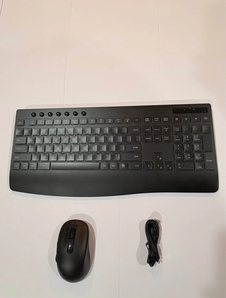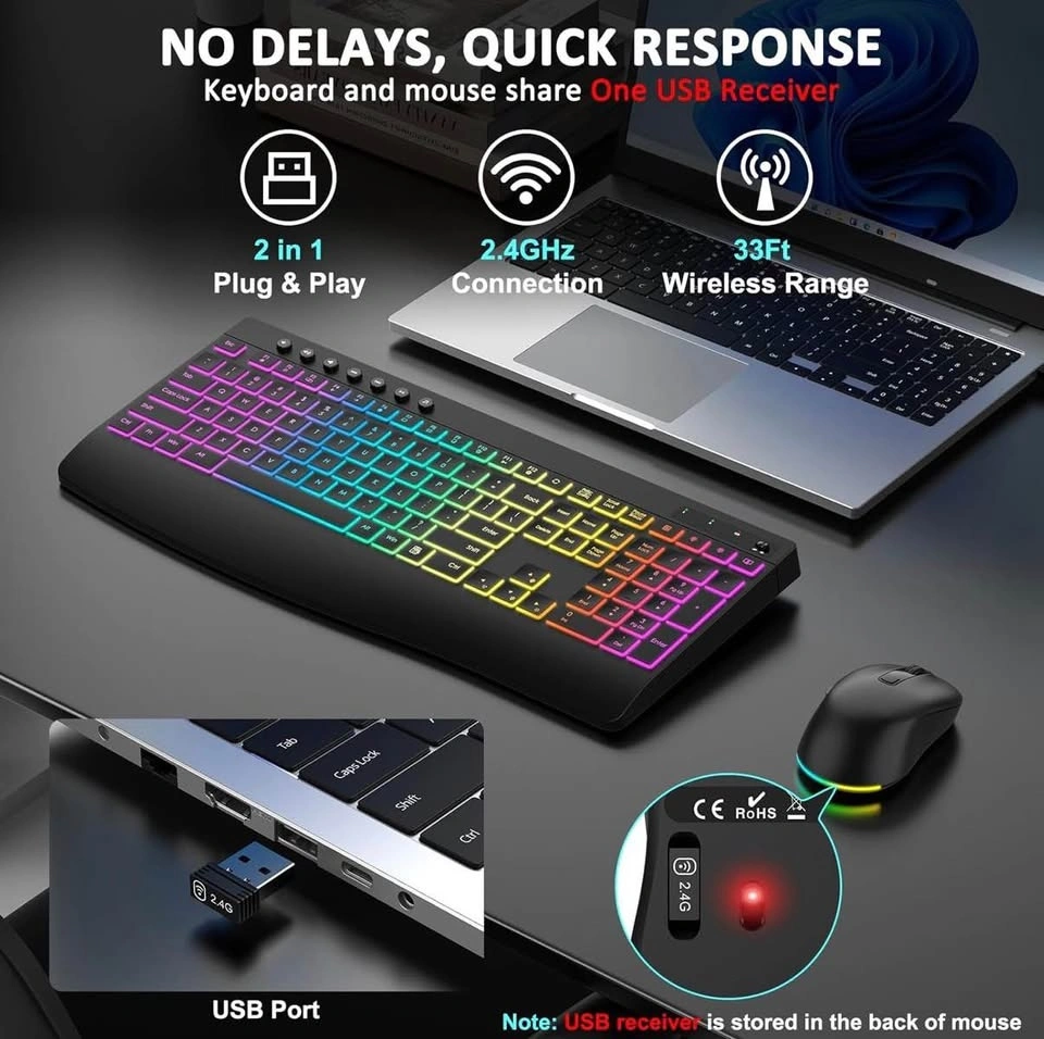 Brand new, rechargeable keyboard and mouse with 9 backlight modes and wrist rest. Quiet, comfortable, and easy plug & play. Works with PC, Mac, and laptop.