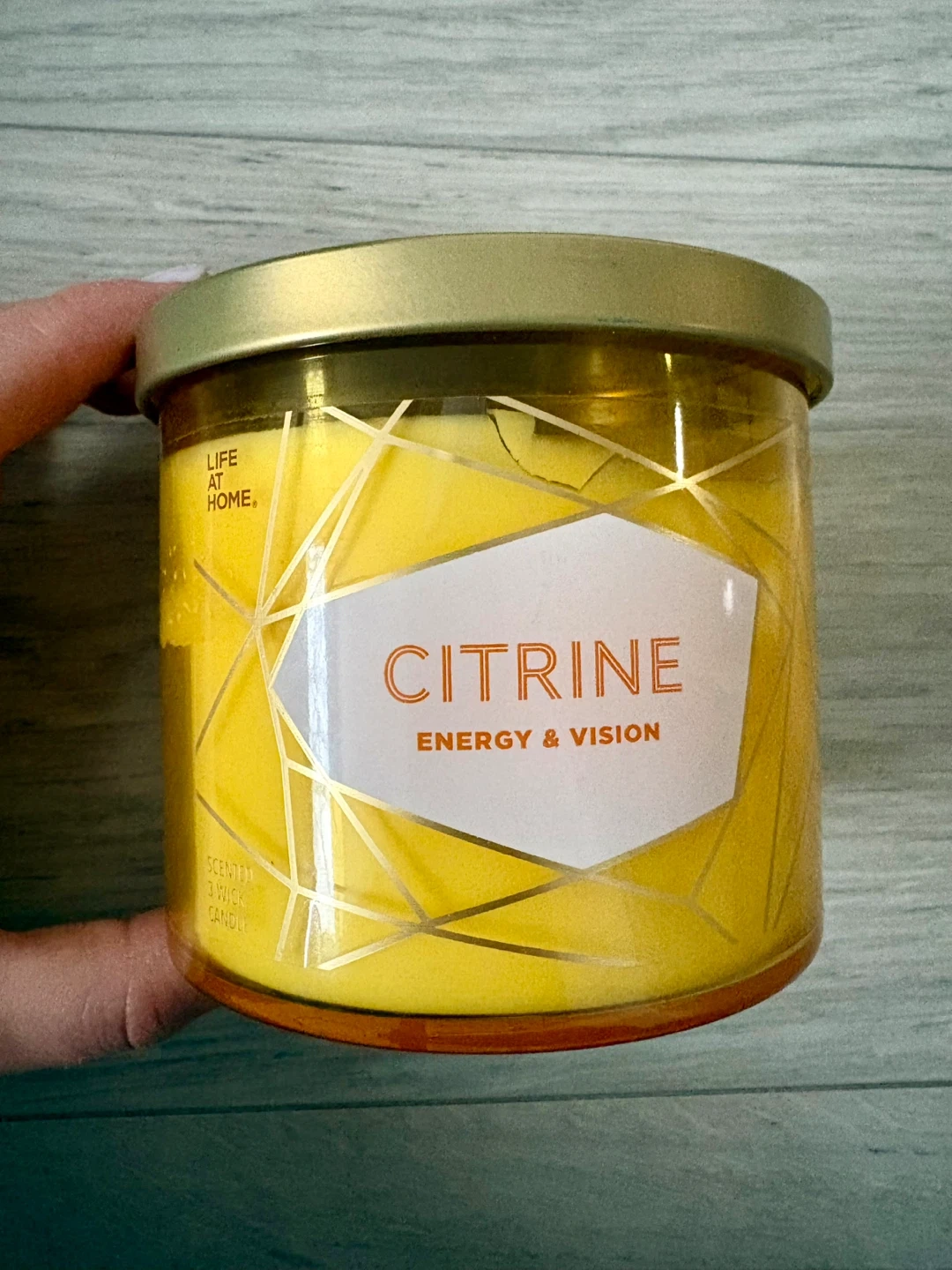 This is a Life At Home Citrine scented candle. It's a 3-wick candle with soy blend wax.