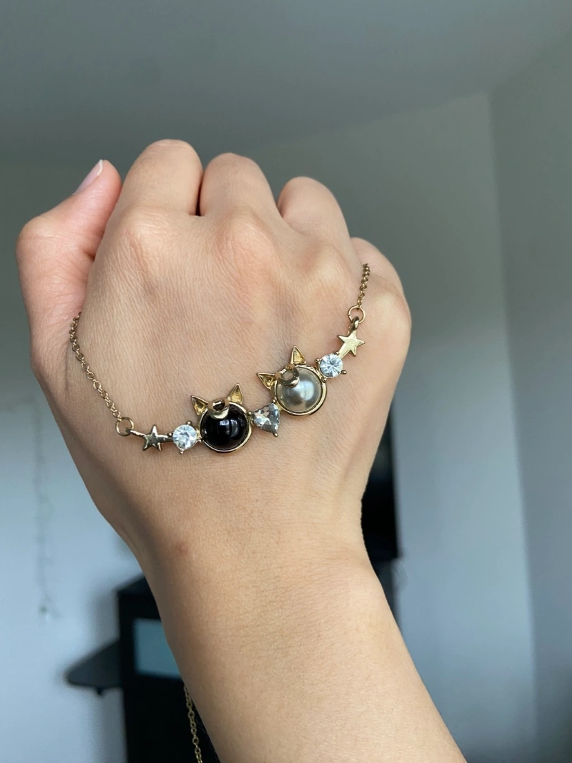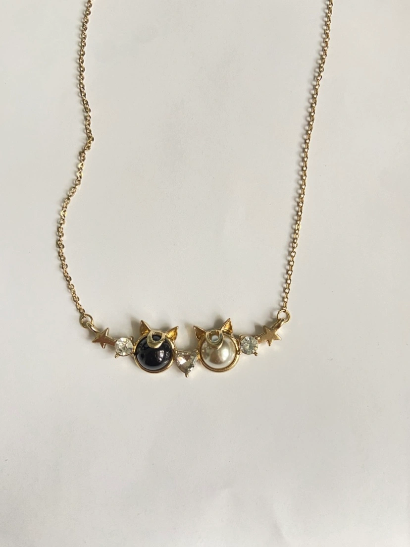 Gold tone necklace featuring two cat face charms, one black and one pearlized, with star and rhinestone accents. Adjustable clasp closure for a custom fit. Brand new, i brought it a while ago but never wear.