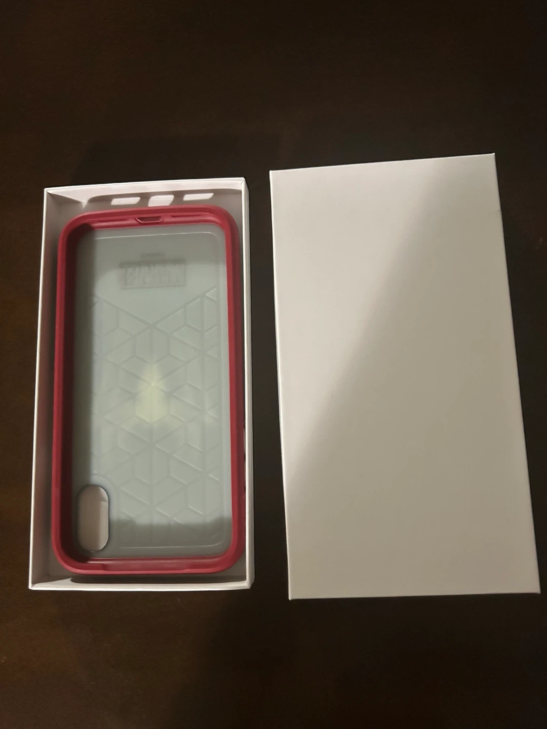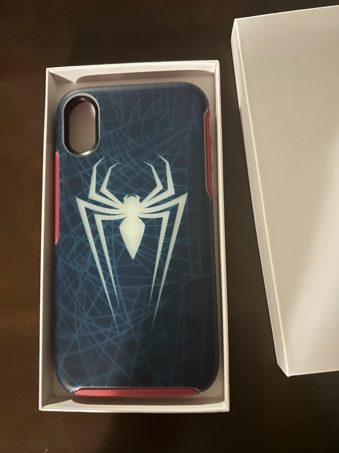 This Spiderman phone case has a cool web design with the classic Spiderman logo. It's a dark blue with red trim. Includes the original box. It's designed for an iPhone X or XS.