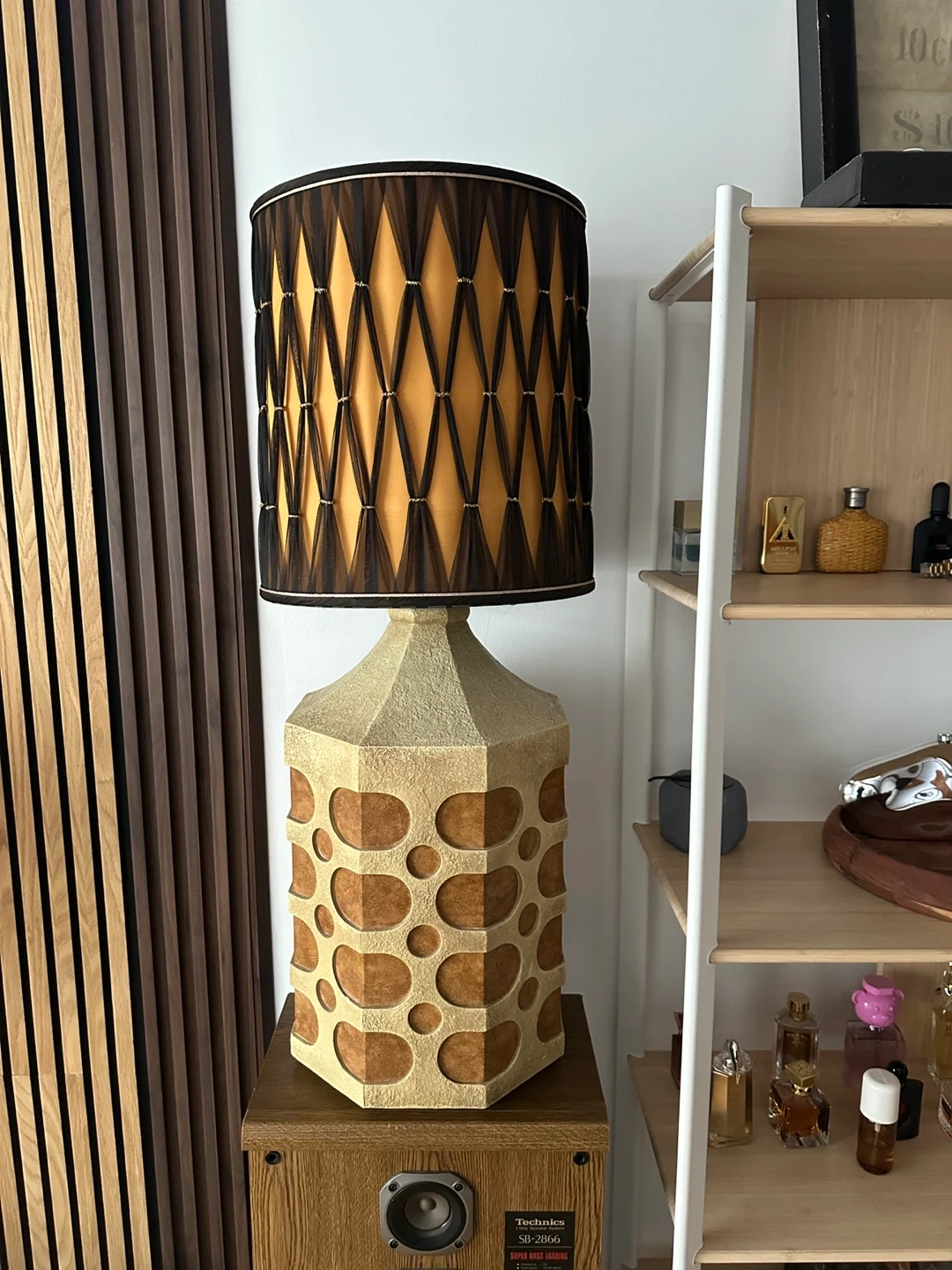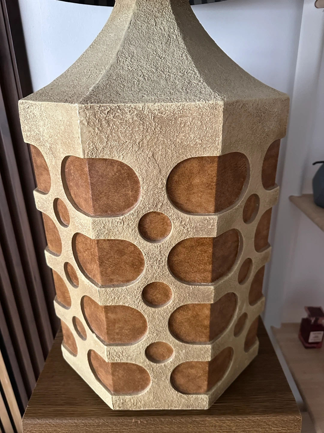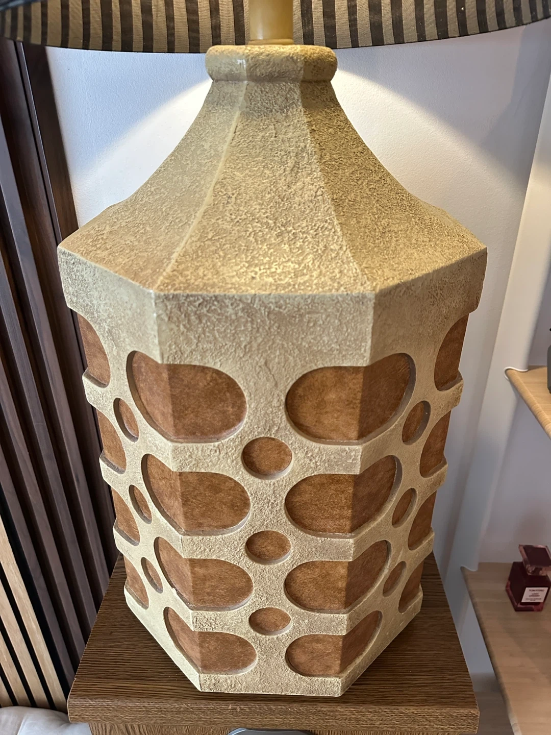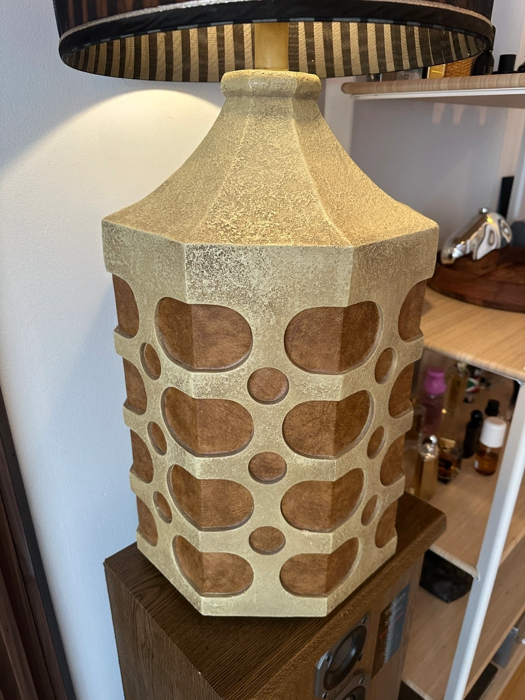 A spectacular oversized giant brutalist table lamp with fantastic shade. Perfect working order. Note: theres one chip at back of lamp that is essentially neglible in terms of visibility but nonethless price is reduced accordingly. Otherwise mint condition. Wow!