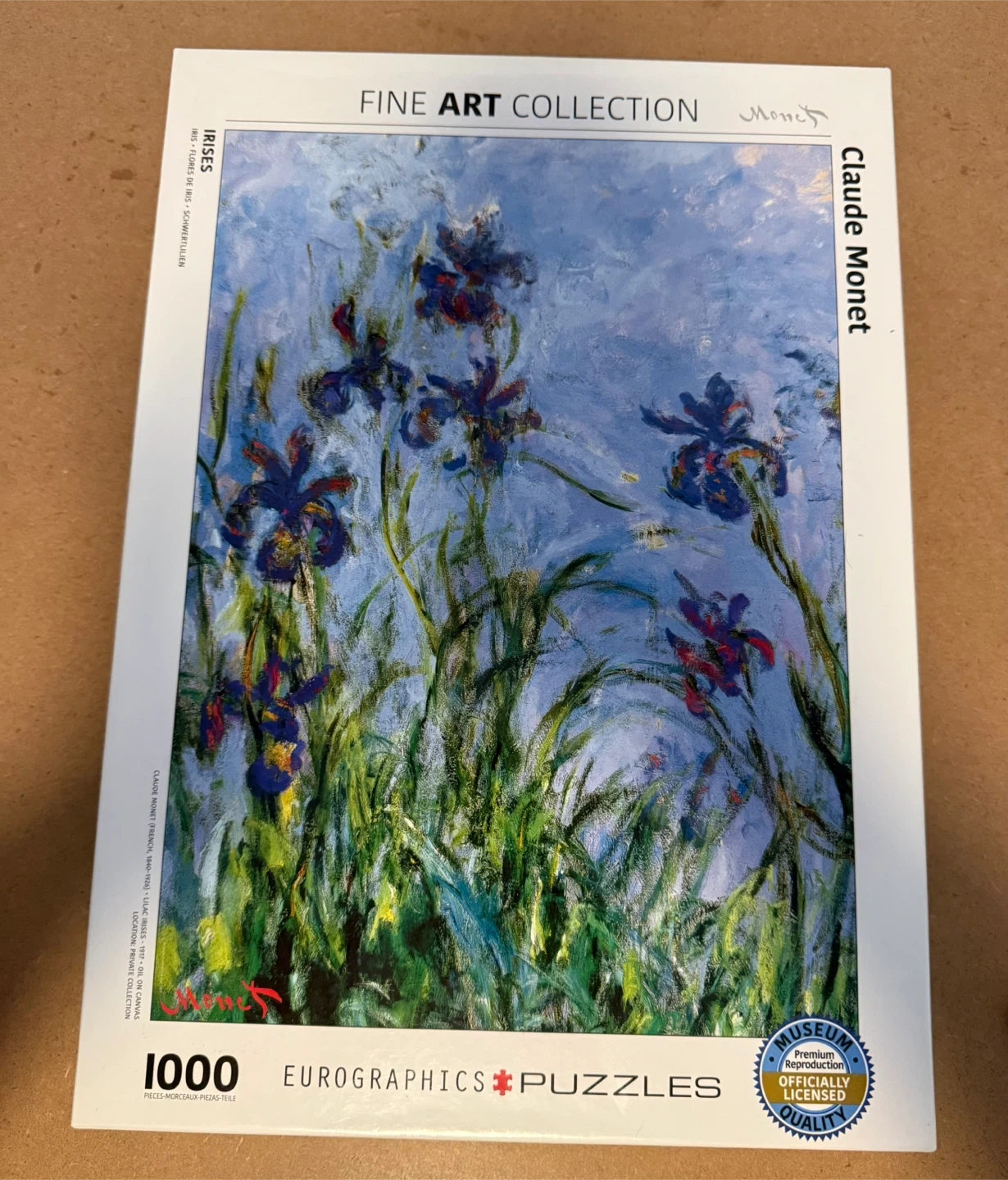 Eurographics 1000 piece puzzle featuring Claude Monet's Irises painting. This is a pain in the A$$ to assemble. I bought it second-hand. What’s more confusing is that there are 200+ EXTRA pieces! So total pieces would be 1,200ish. I had it counted manually, then my mom did a second count to make sure. So just be aware of it.