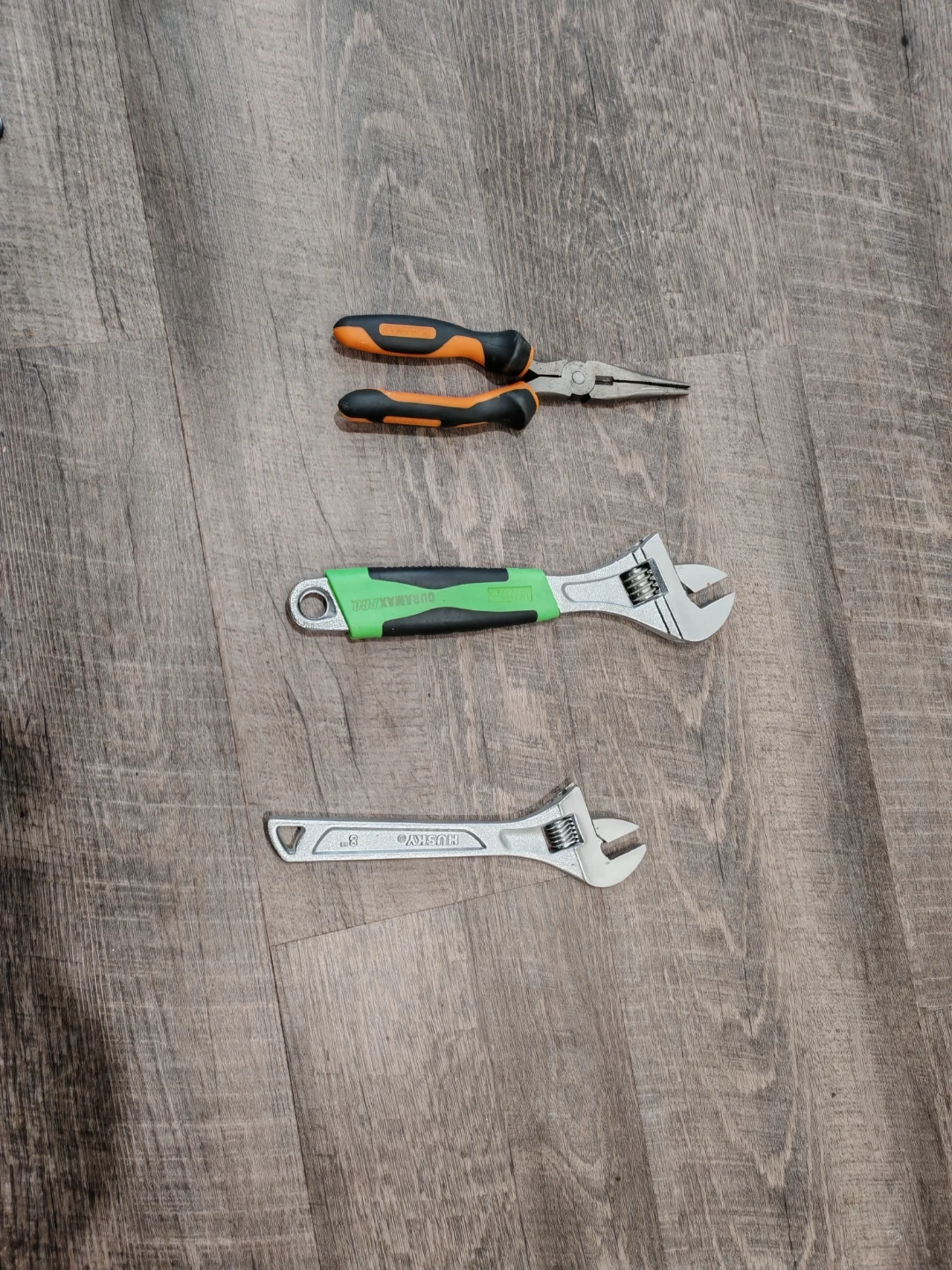 This set includes a Husky 8-inch adjustable wrench and a Duramax Pro adjustable wrench, along with a pair of long-nose pliers. The pliers have orange and black grips. These tools are useful for various repair and maintenance tasks.