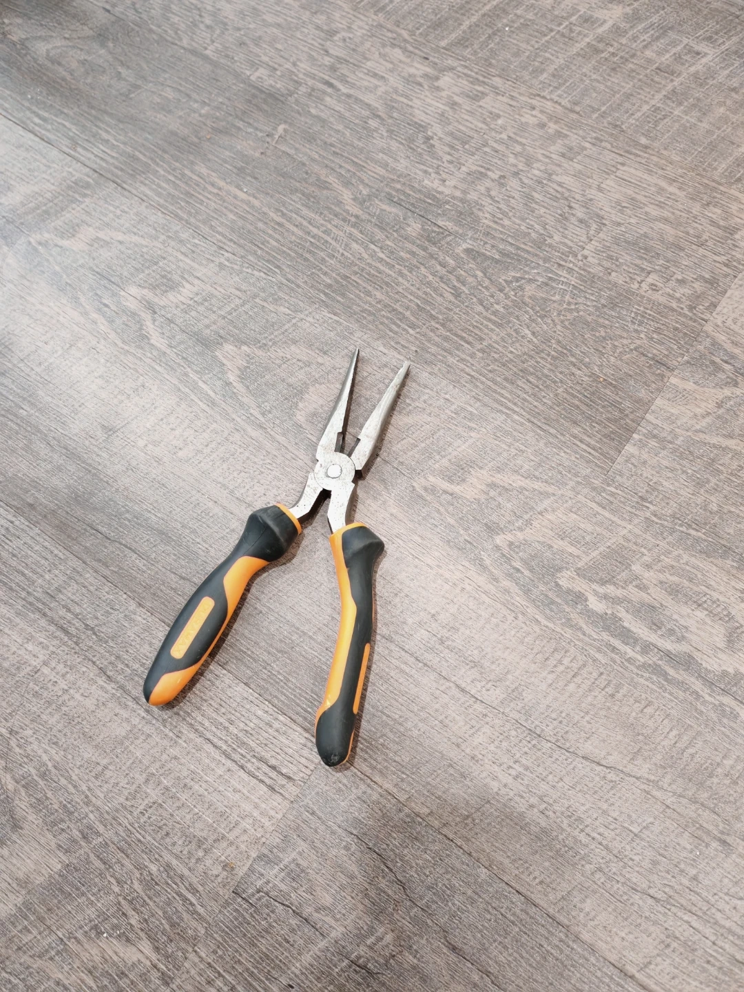 This set includes a Husky 8-inch adjustable wrench and a Duramax Pro adjustable wrench, along with a pair of long-nose pliers. The pliers have orange and black grips. These tools are useful for various repair and maintenance tasks.