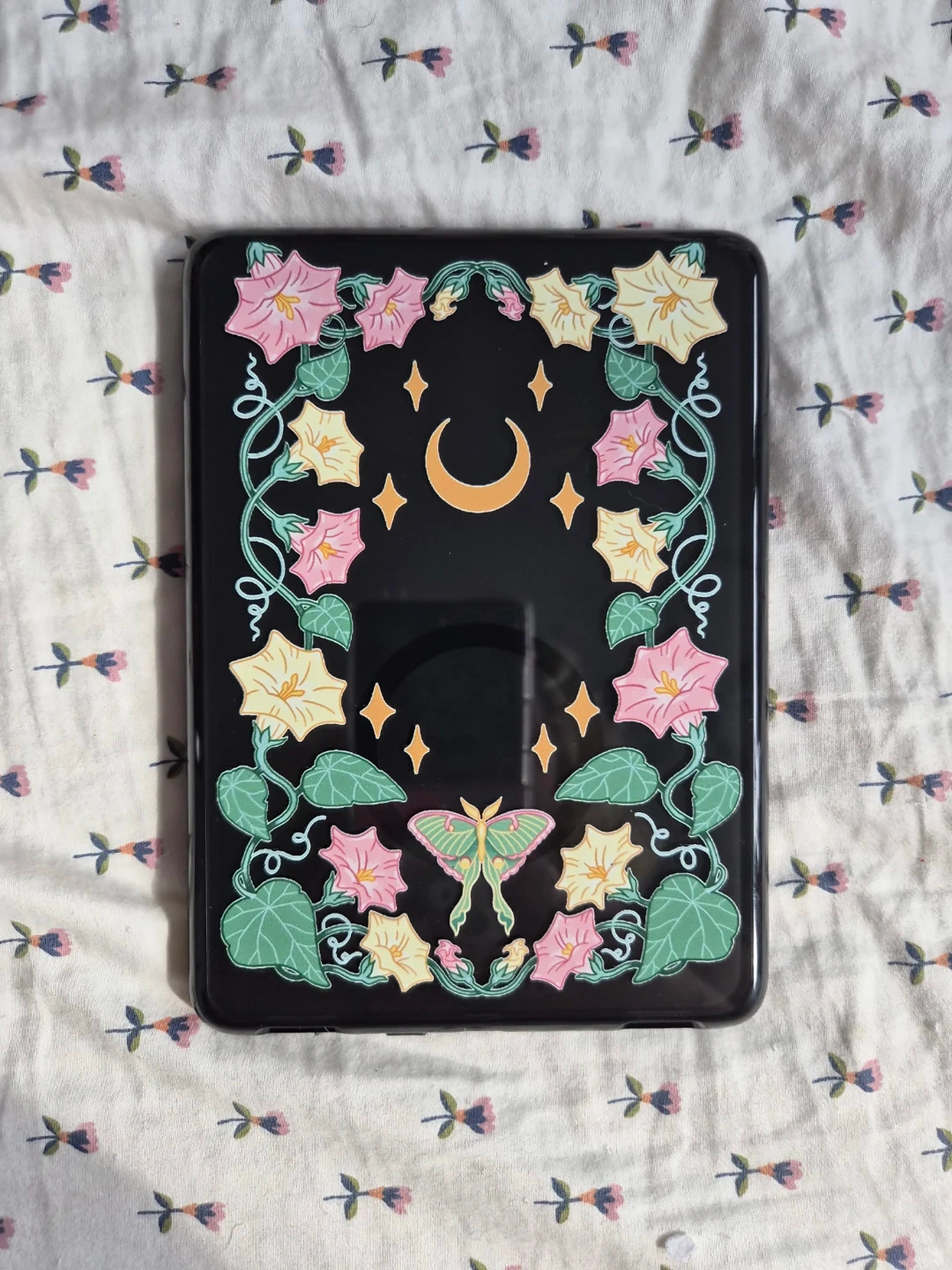 Amazon Kindle e-reader with a black protective case featuring a celestial moon and moth design. The case has a decorative floral vine pattern. It's lightweight and portable for reading on the go. Perfect for book lovers!
