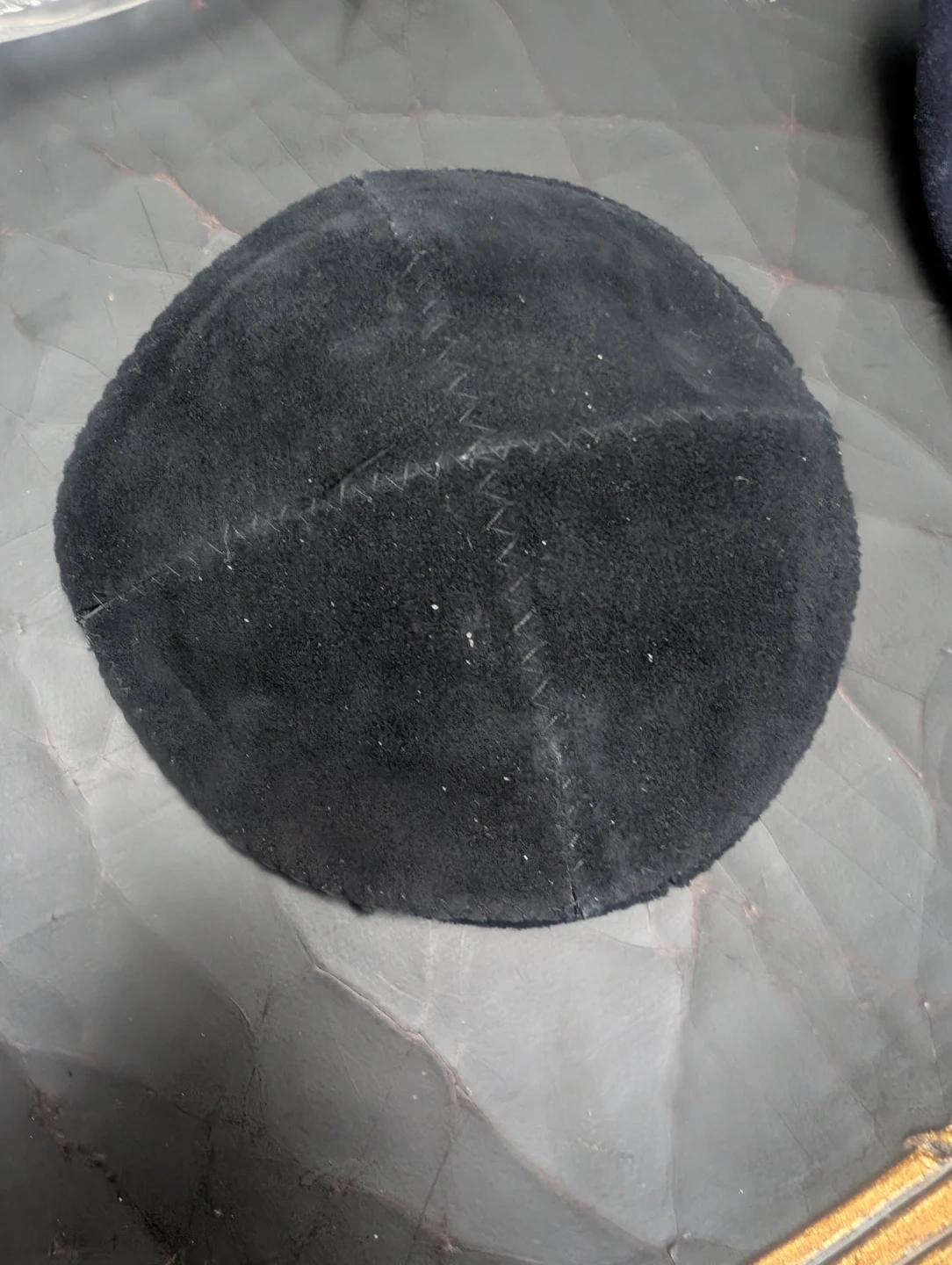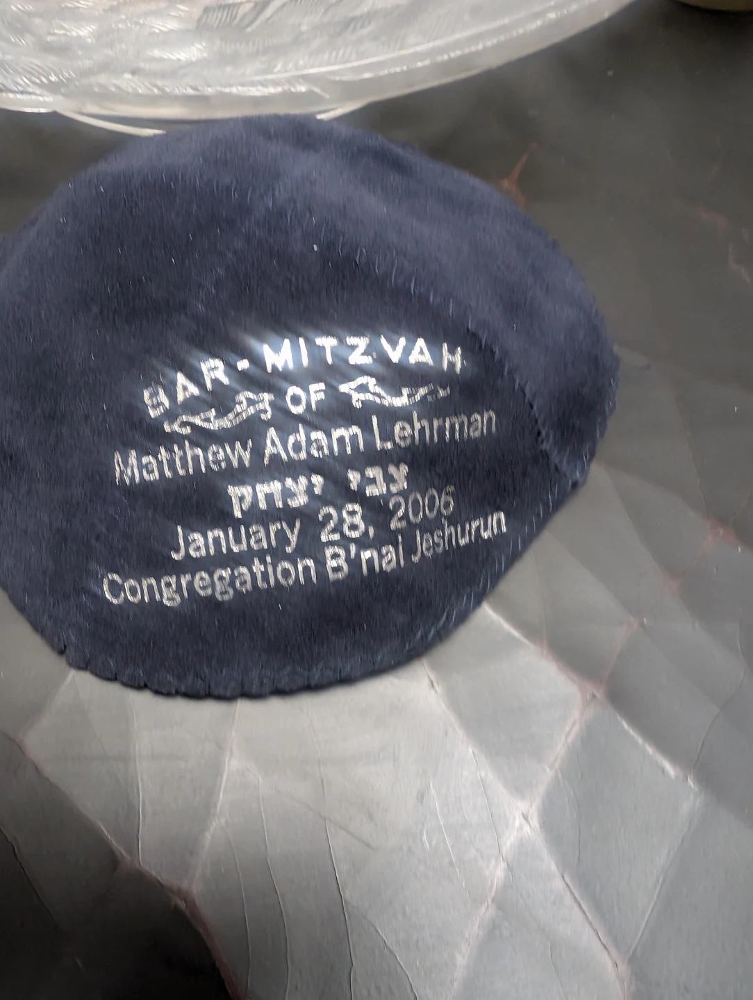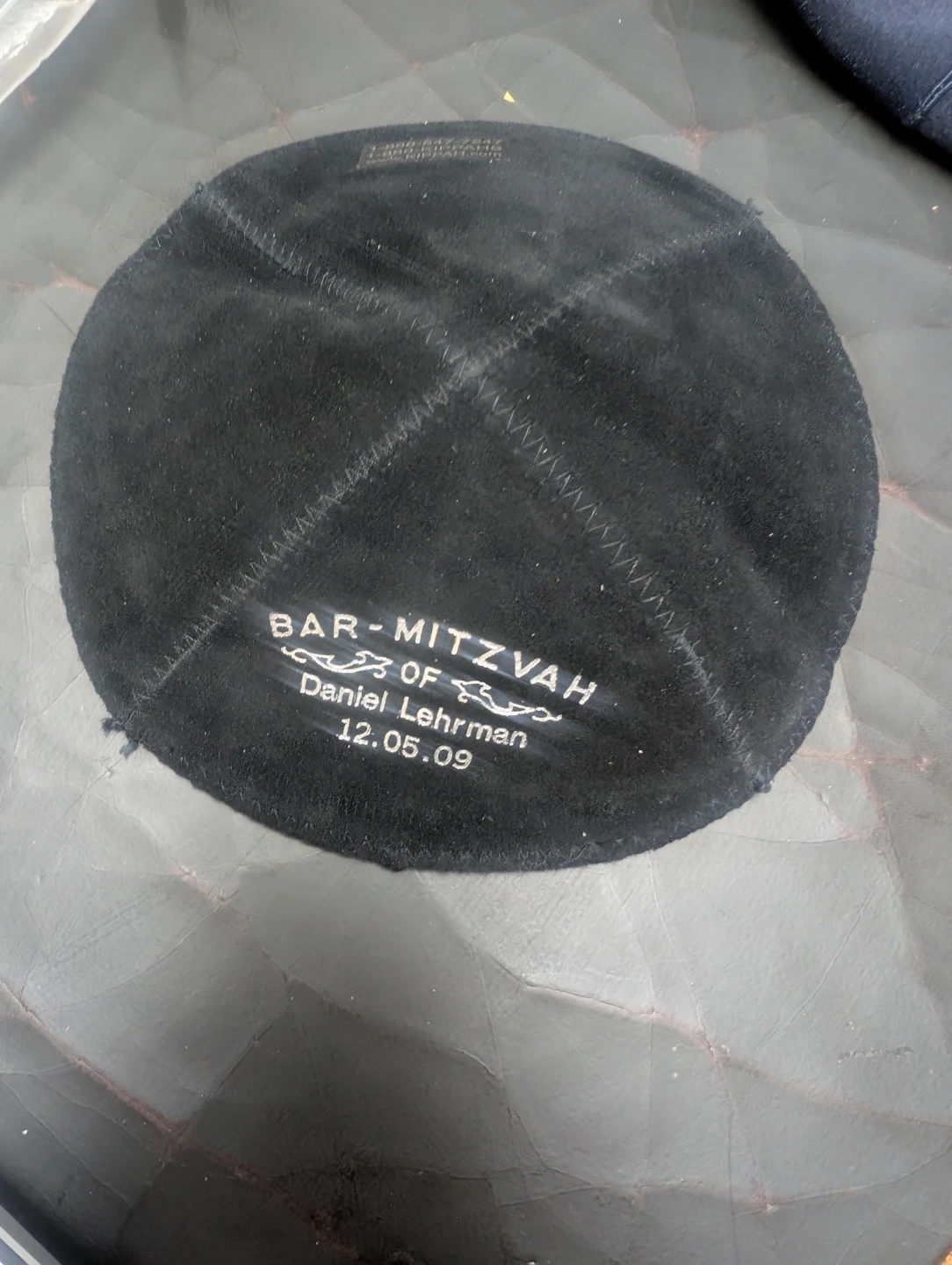 This blue suede kippah was personalized for Michael Bishansky's Bar Mitzvah on September 16, 2006. It's a soft, round head covering. Includes a black kippah as well.