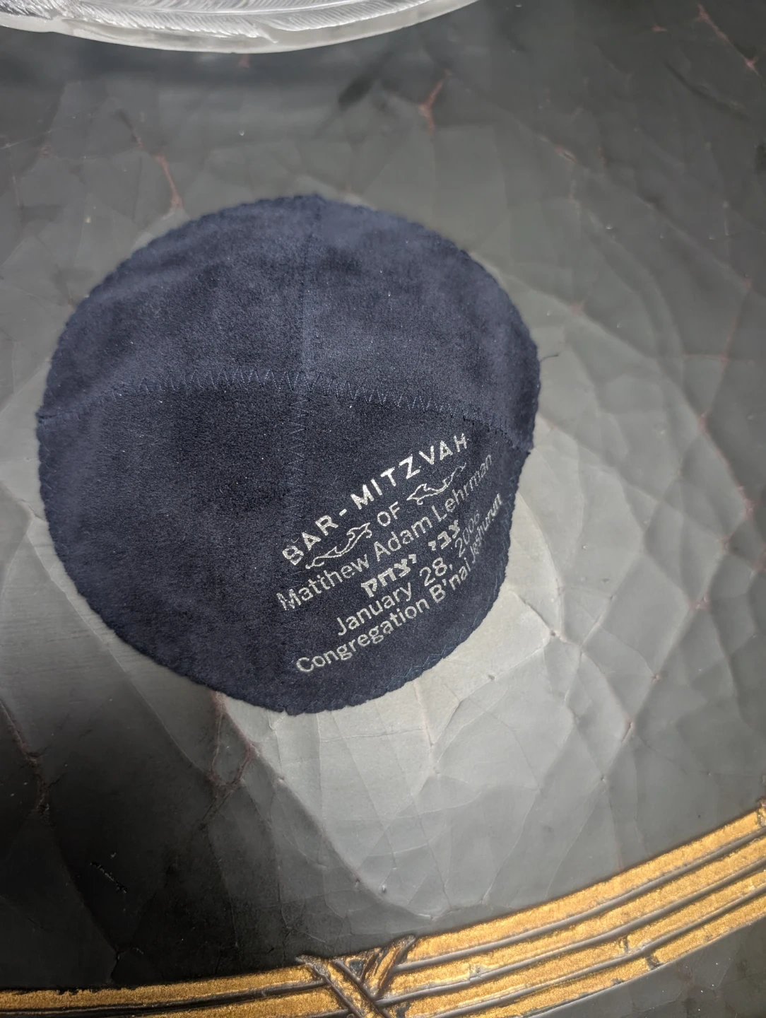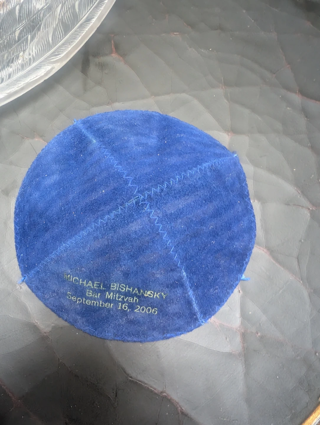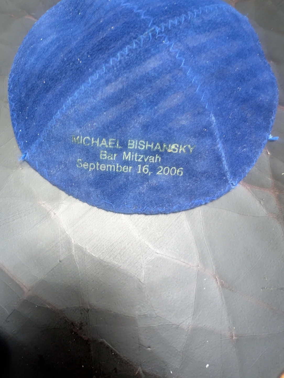 This blue suede kippah was personalized for Michael Bishansky's Bar Mitzvah on September 16, 2006. It's a soft, round head covering. Includes a black kippah as well.