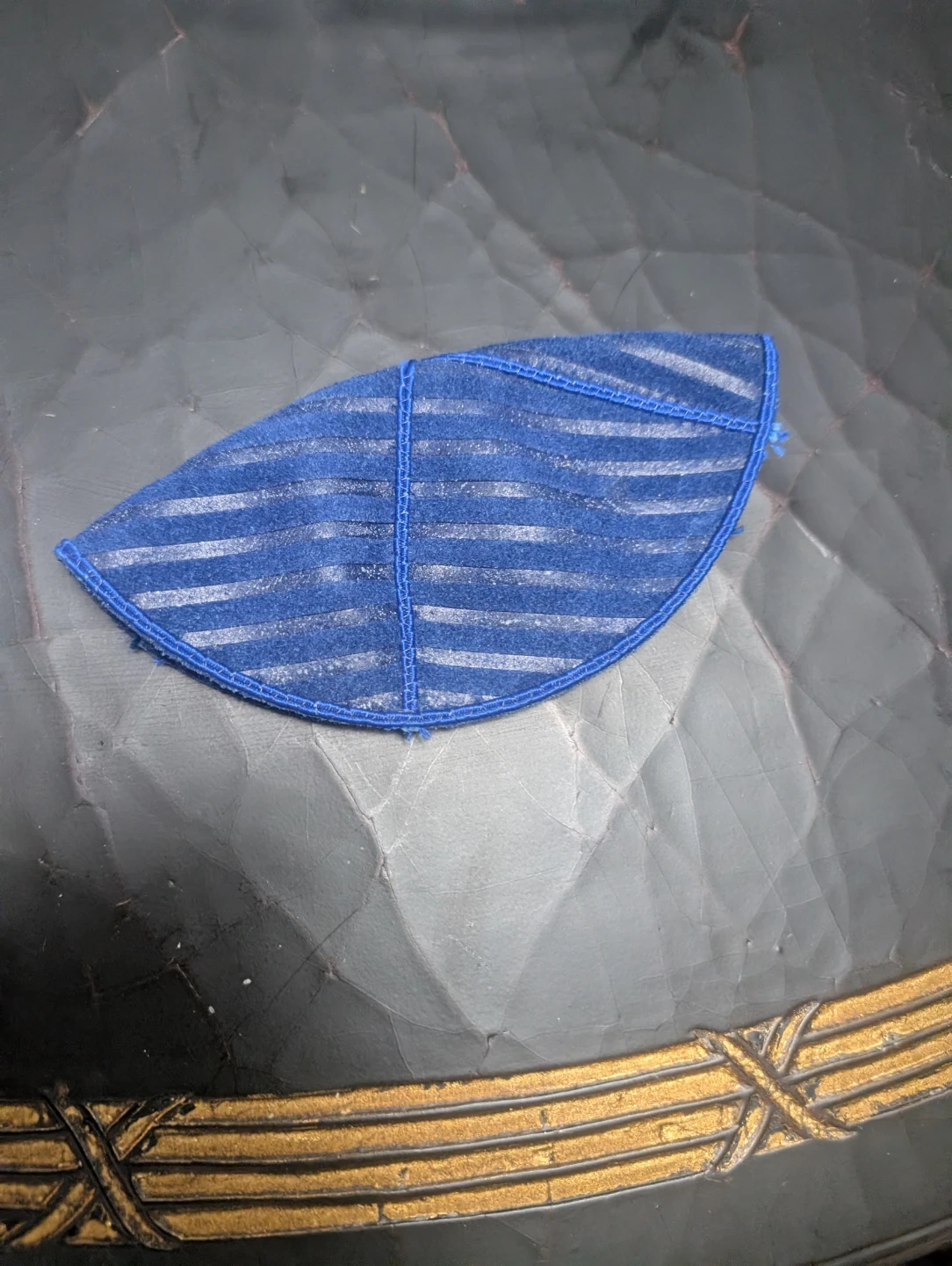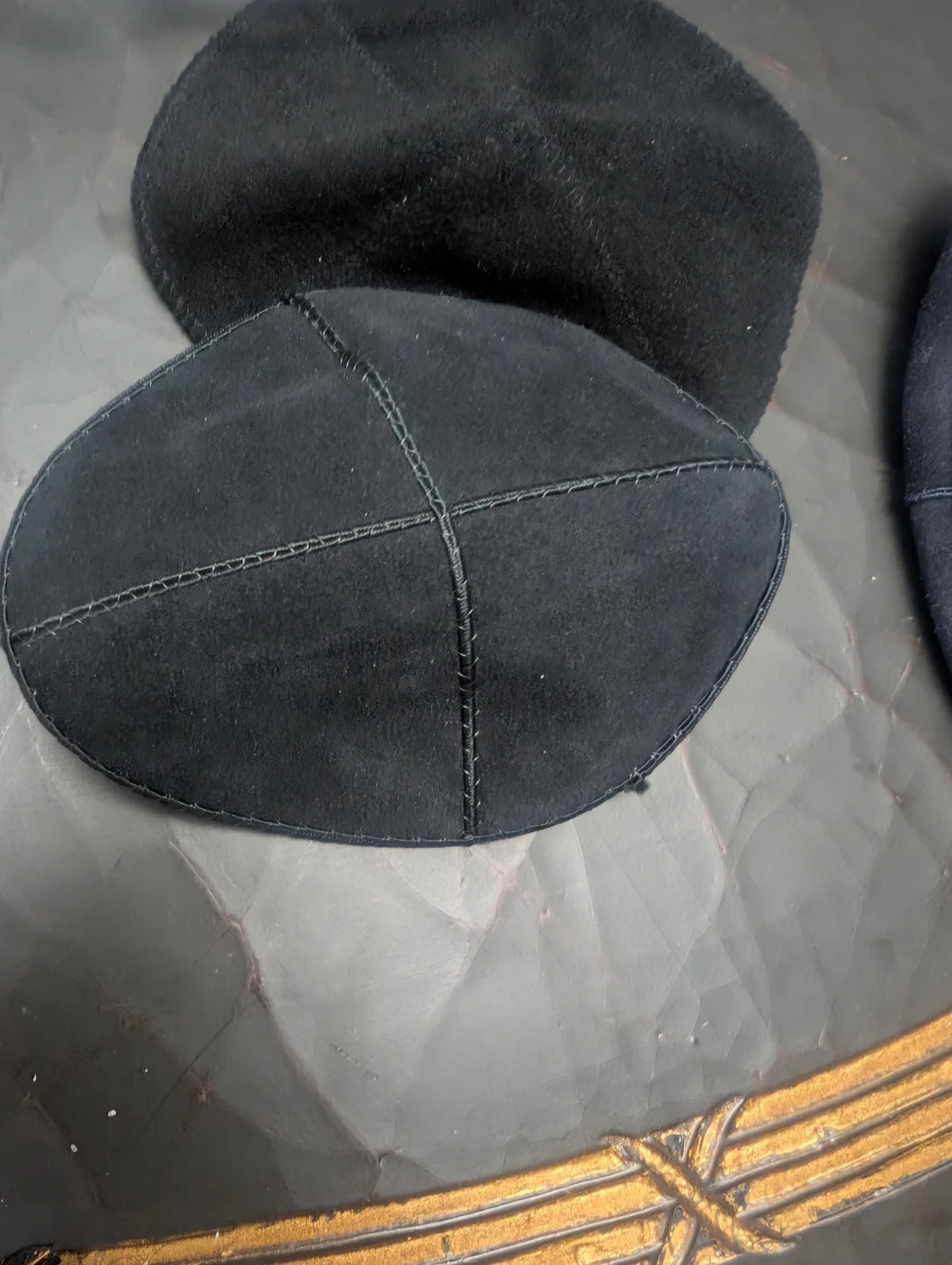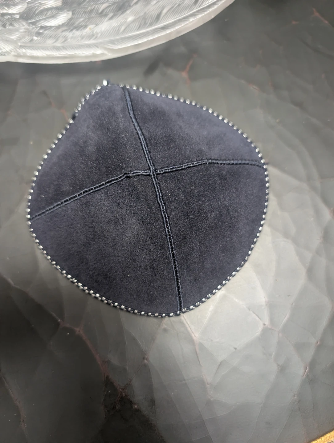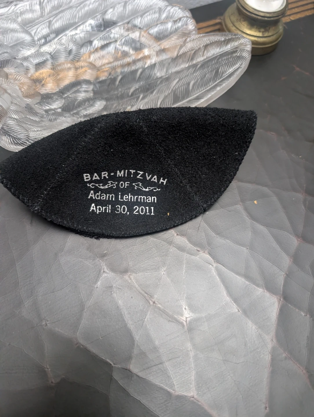 This blue suede kippah was personalized for Michael Bishansky's Bar Mitzvah on September 16, 2006. It's a soft, round head covering. Includes a black kippah as well.
