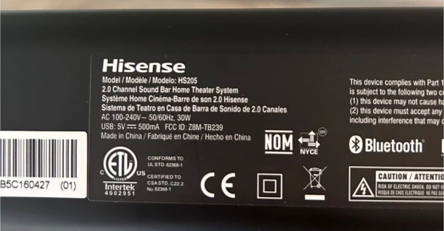 This is a Hisense HS205 2.0 Channel Sound Bar Home Theater System. It's a black soundbar with a remote. Includes USB power.