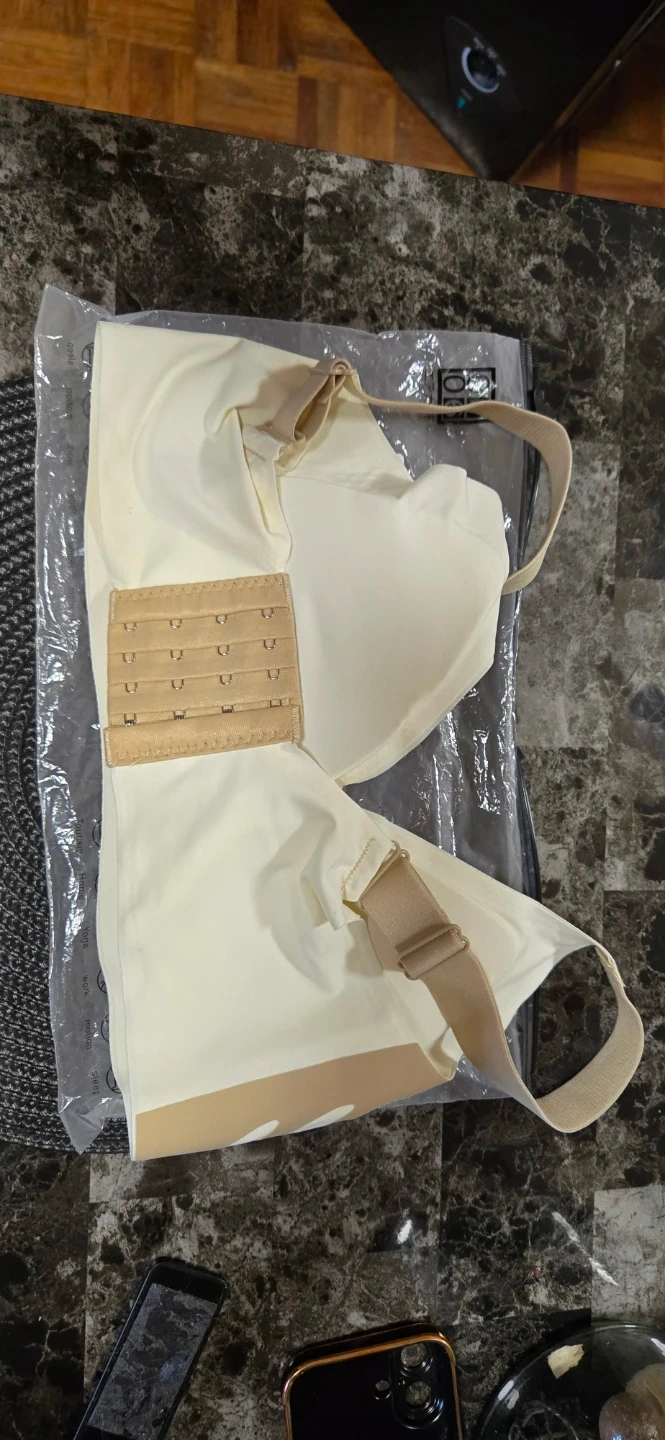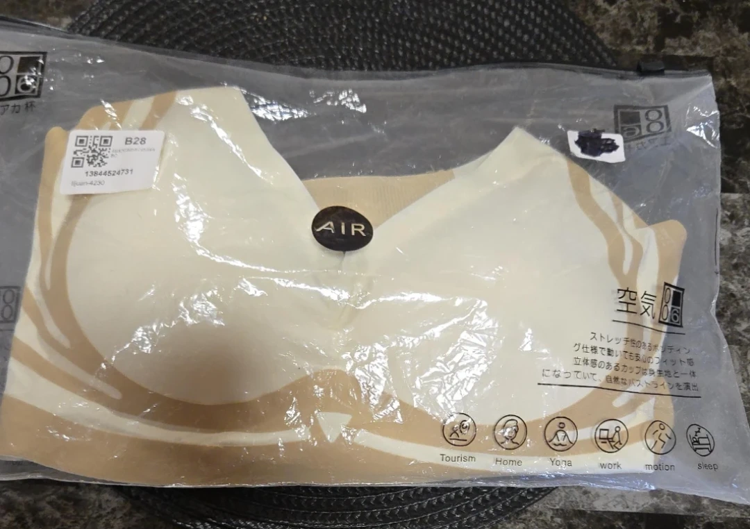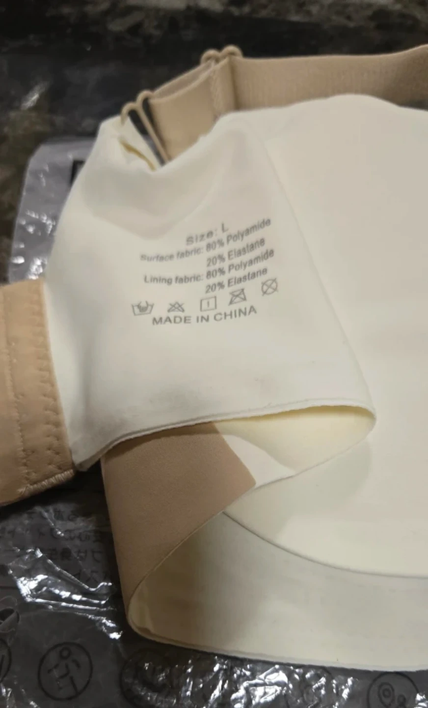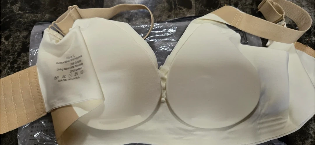 This beige wireless bra is size L. Surface fabric is 80% Polyamide and 20% Elastane, with lining fabric also 80% Polyamide and 20% Elastane.