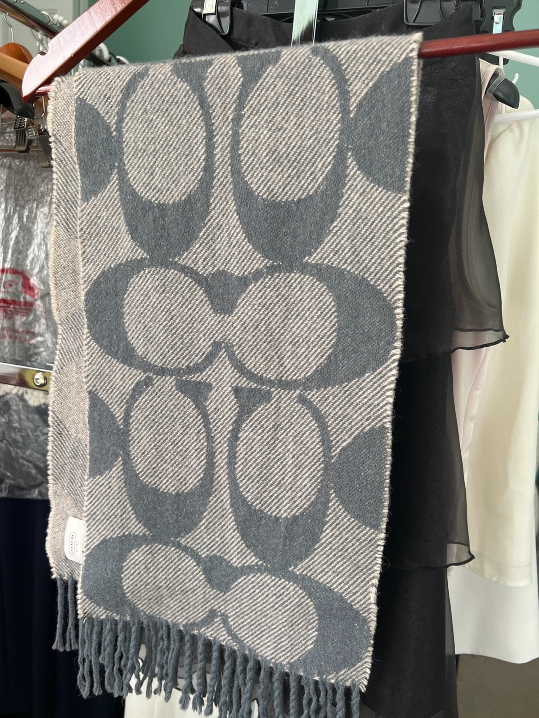 Coach scarf made from a blend of 90% wool and 10% cashmere. Features the iconic Coach signature pattern. Perfect for adding a touch of warmth and style to any winter outfit!