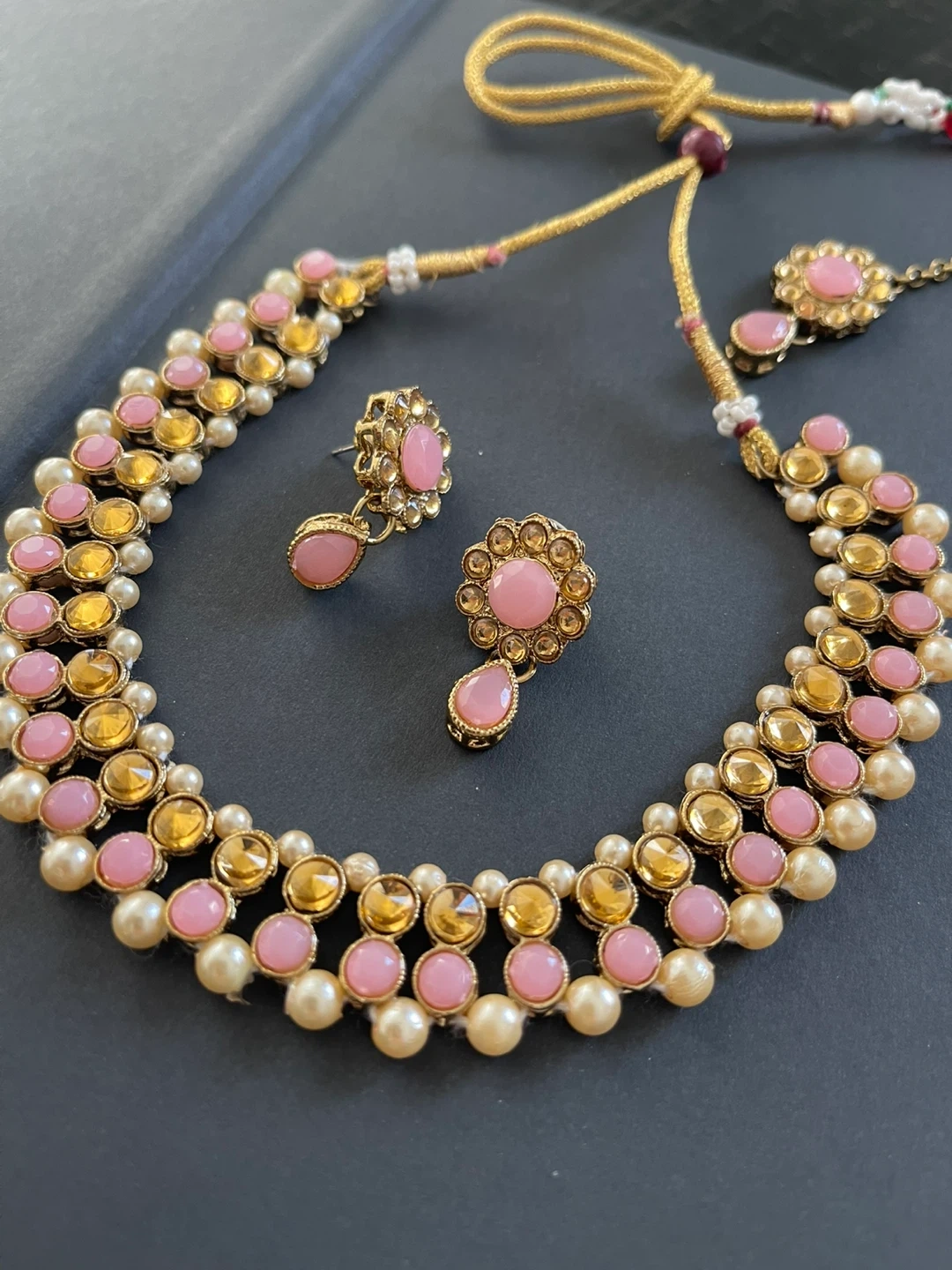 This is a lovely necklace set featuring pink and gold beads, accented with faux pearls. It includes matching earrings and a tie-back closure. The set's ornate design makes it a great addition for special occasions.