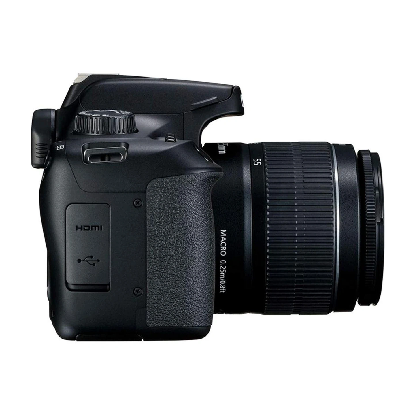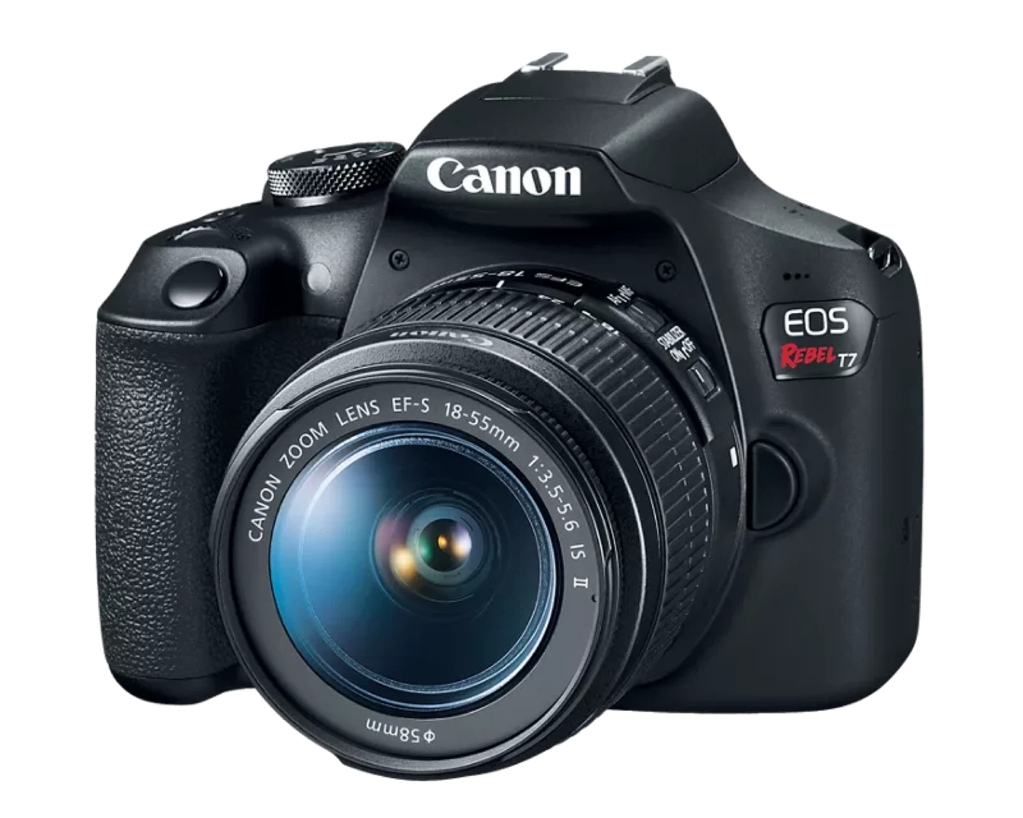 This Canon EOS Rebel T7 DSLR camera comes with an 18-55mm zoom lens. It's a black digital camera ready for your photography needs. Capture your moments with its versatile lens!