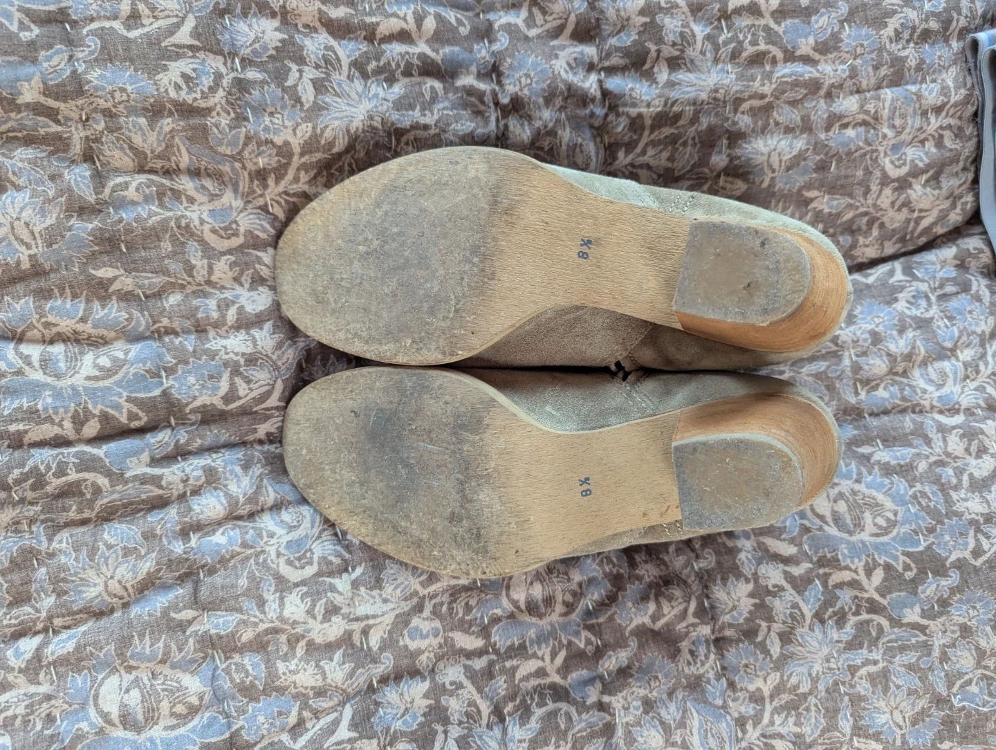 Gently used condition Madewell genuine suede ankle boots. Stacked wood heel, lovely damp sand colour. Marked 8.5, fit TTS.