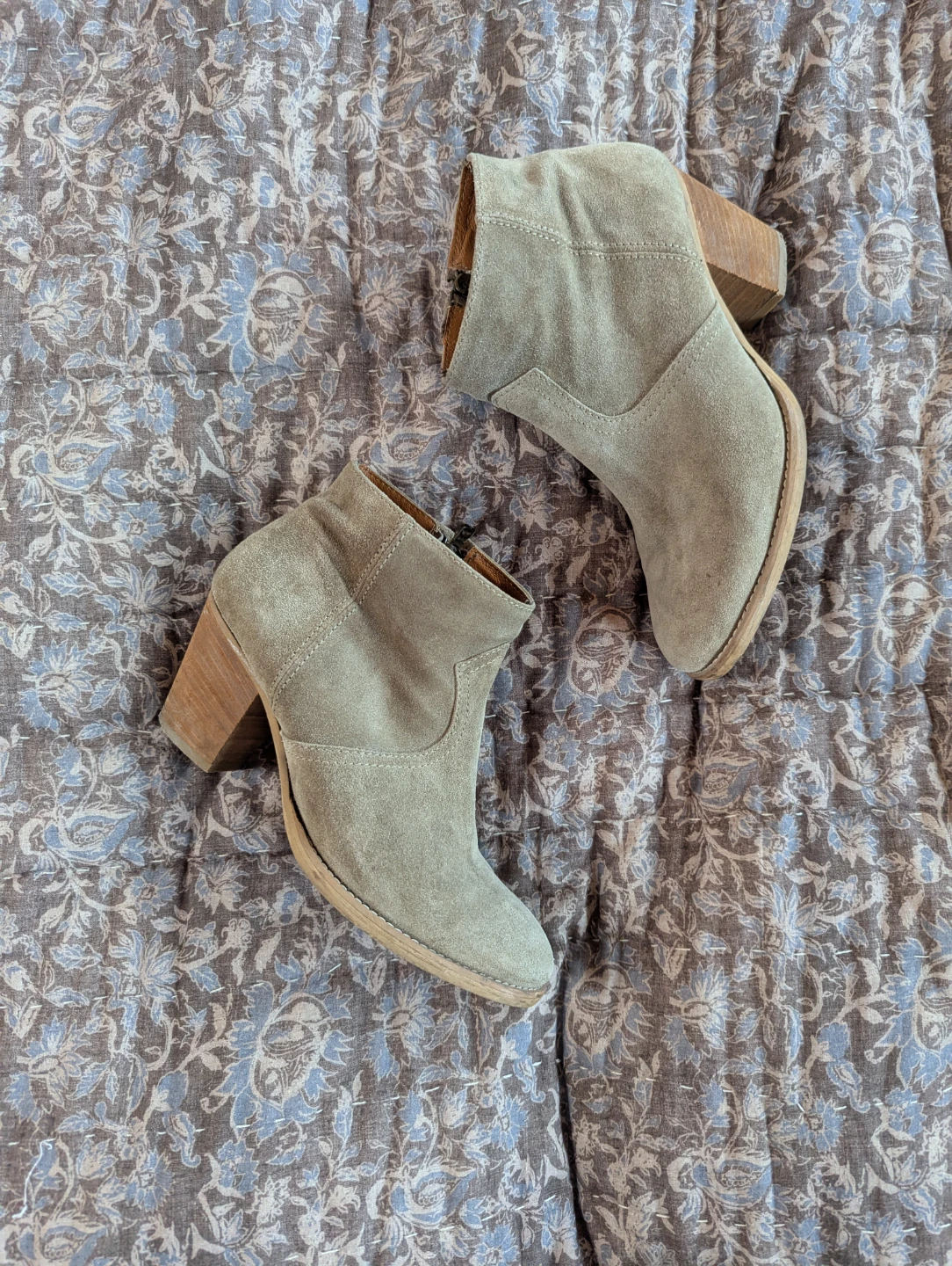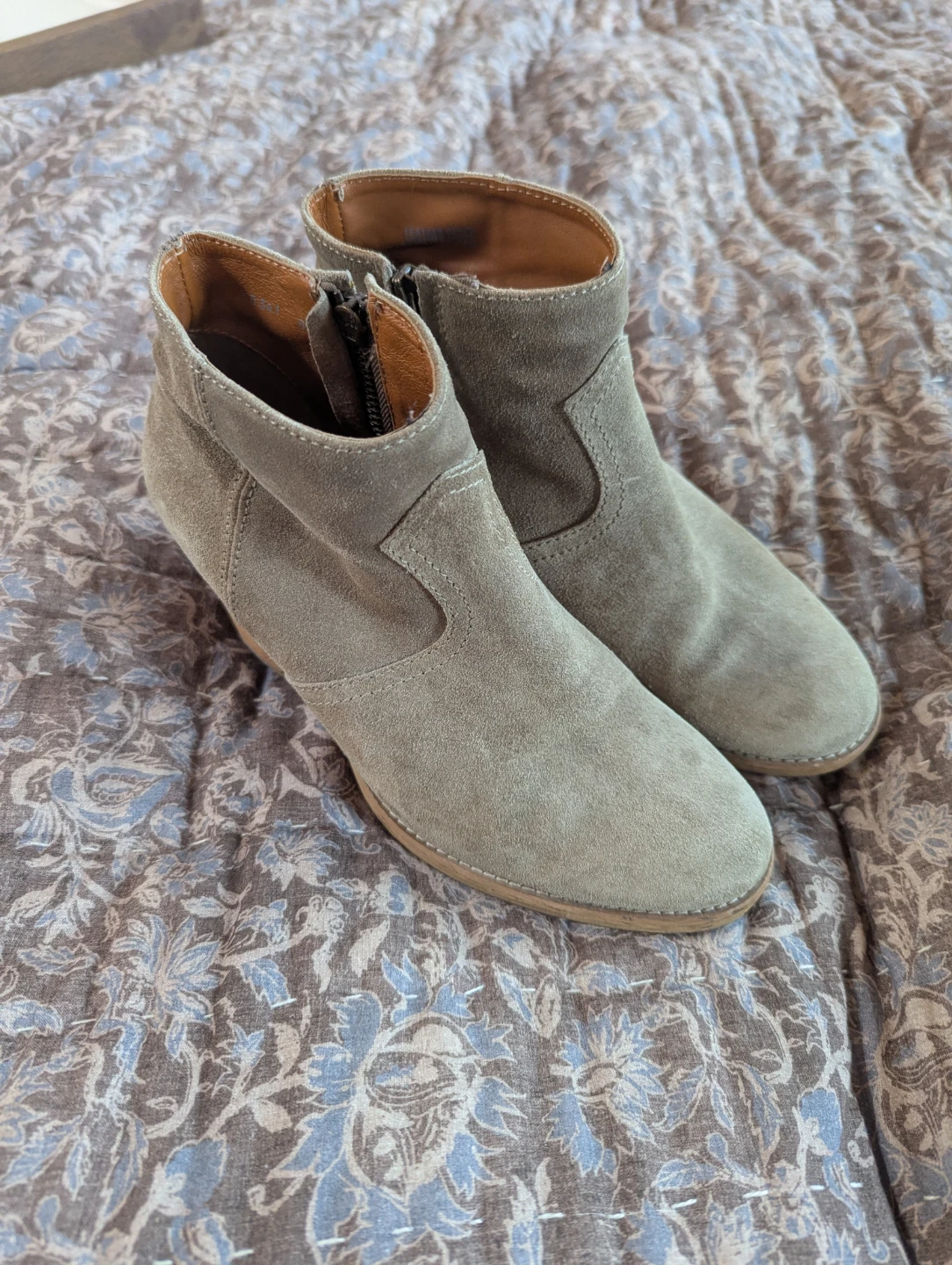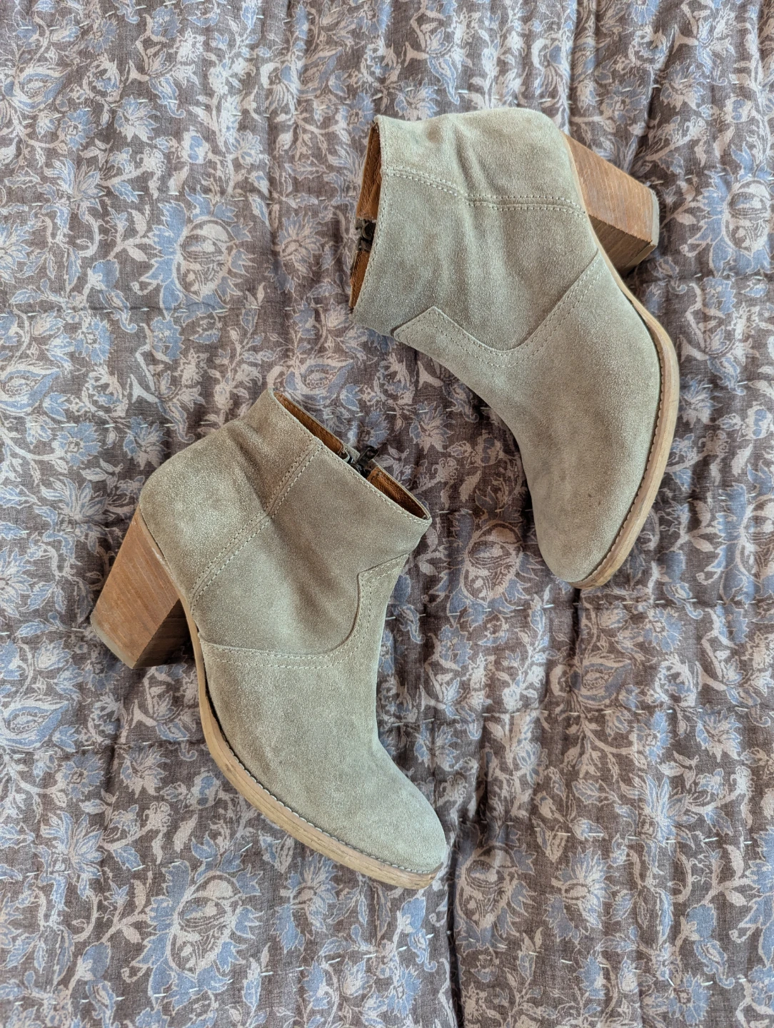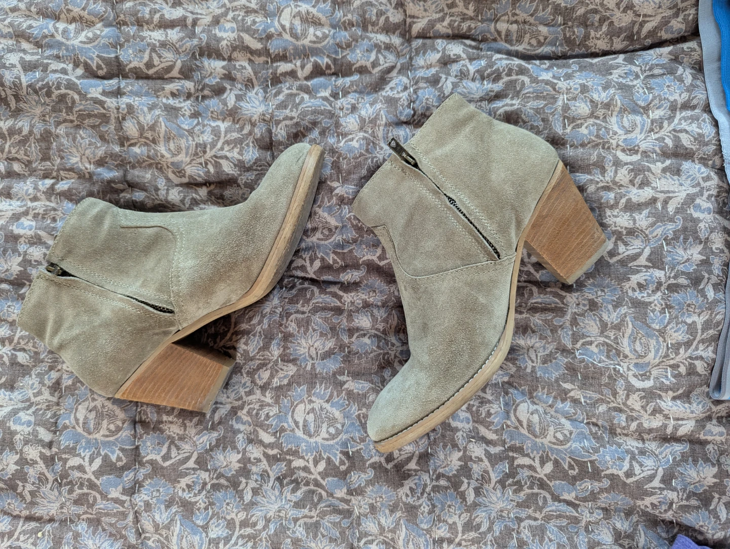 Gently used condition Madewell genuine suede ankle boots. Stacked wood heel, lovely damp sand colour. Marked 8.5, fit TTS.