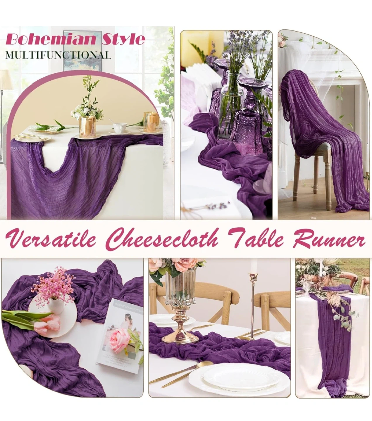 This cheesecloth table runner comes in a beautiful plum purple colour. It's made from a cotton and linen blend fabric with a natural wrinkle, sheer appearance, and soft touch. The package includes 6 packs and one laundry bag. Adds an elegant and romantic vintage touch to any table setting!
