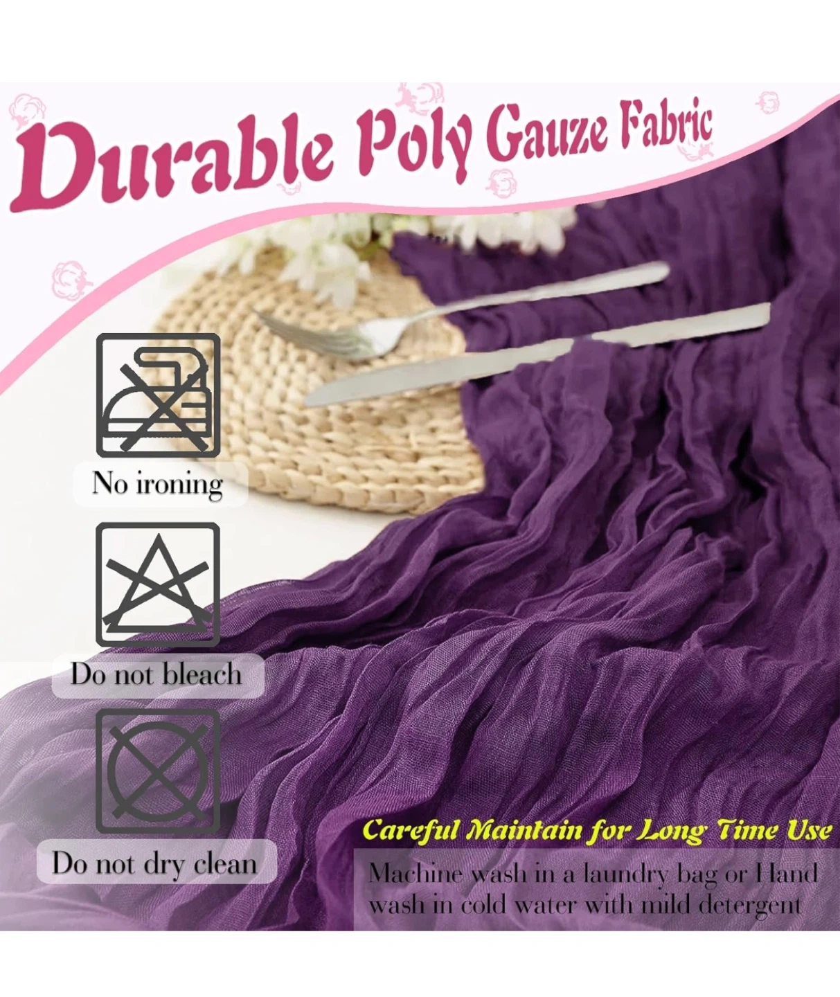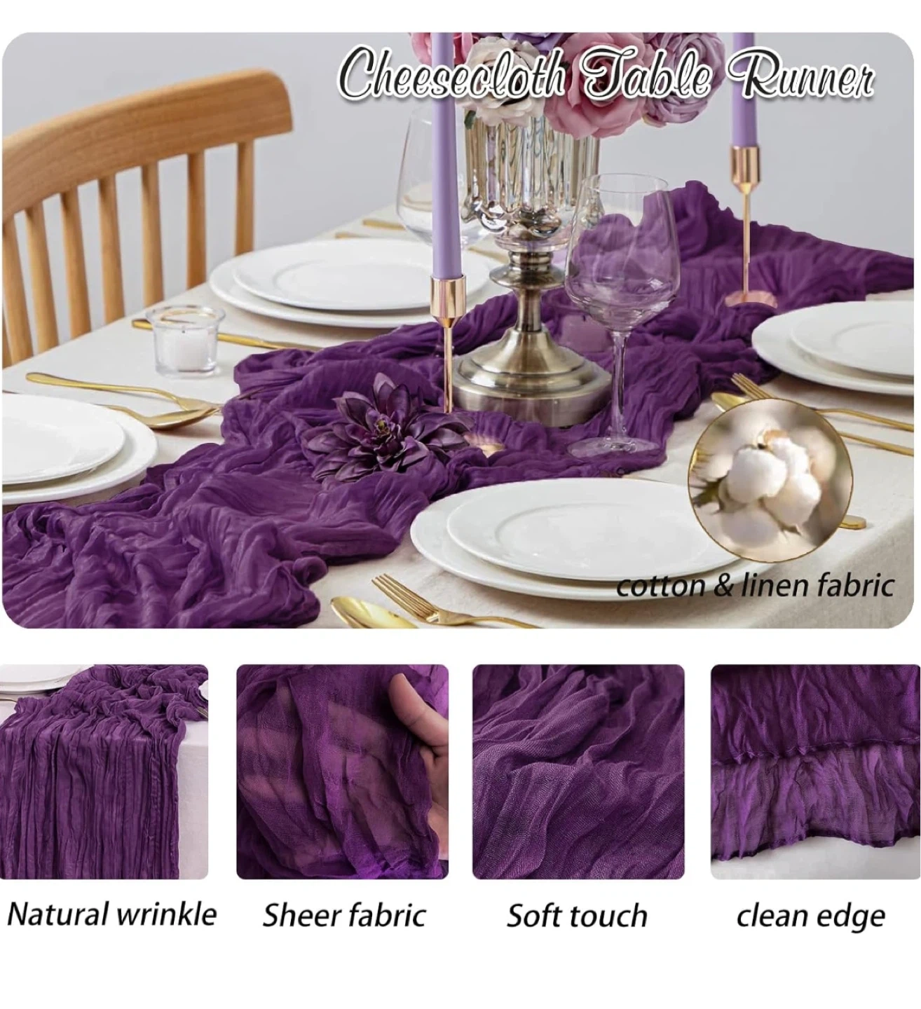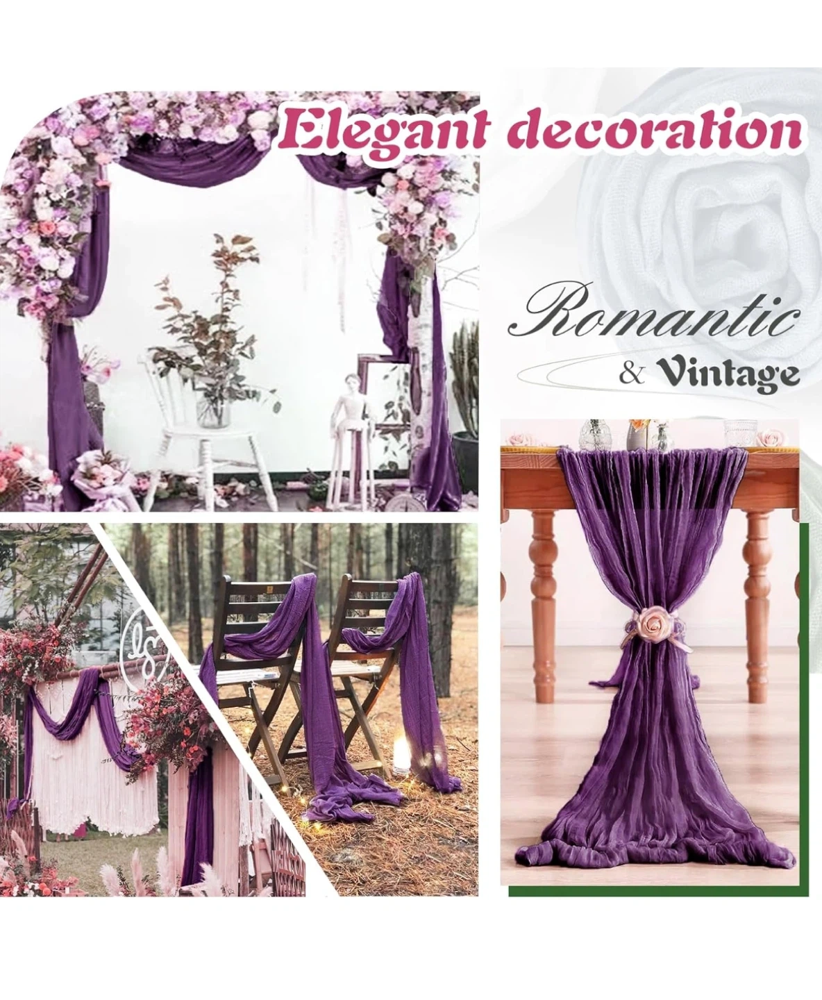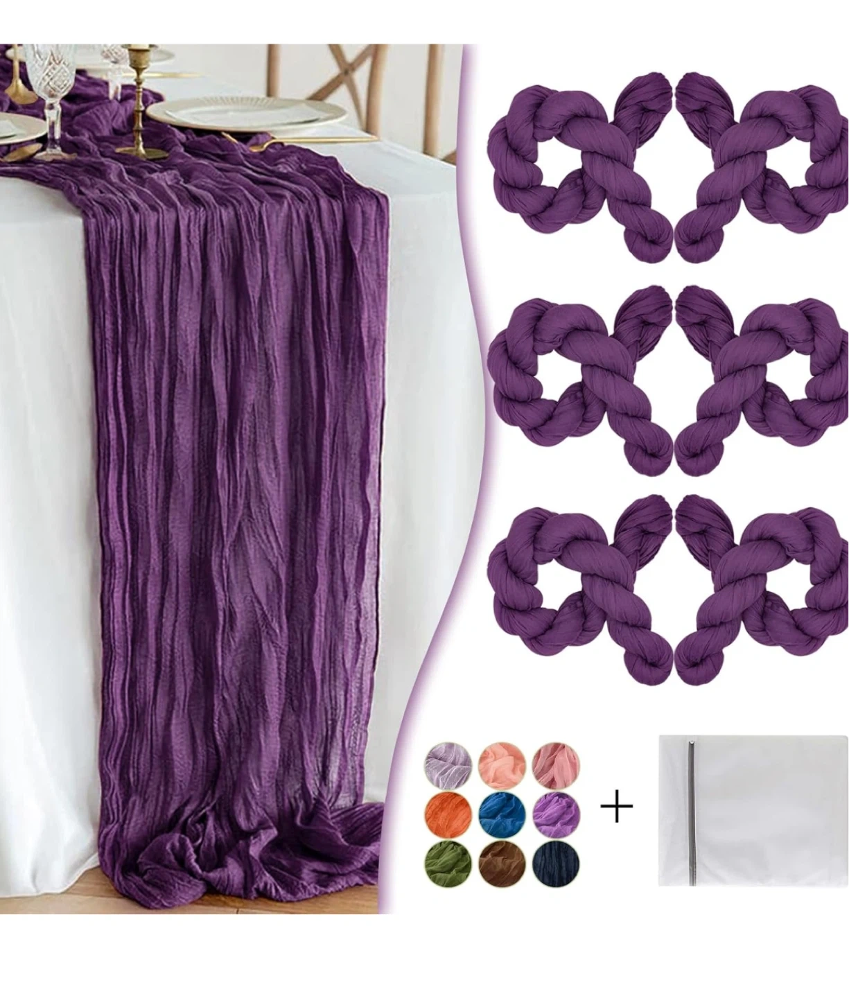 This cheesecloth table runner comes in a beautiful plum purple colour. It's made from a cotton and linen blend fabric with a natural wrinkle, sheer appearance, and soft touch. The package includes 6 packs and one laundry bag. Adds an elegant and romantic vintage touch to any table setting!