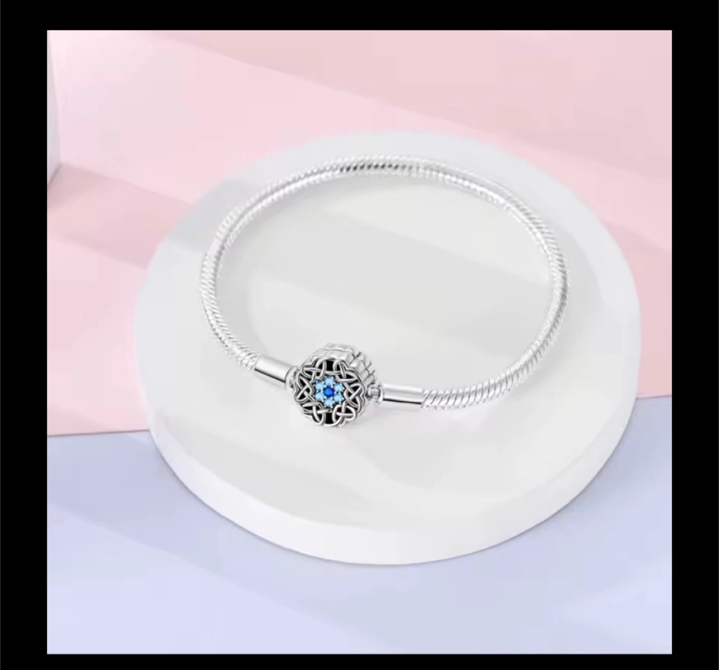 🏆This silver-tone snake chain bracelet features a decorative clasp with blue stones. The clasp measures 0.47 inches (11.9mm) and the bracelet chain is 0.12 inches (3.1mm) thick. It's designed to hold charms.🏆