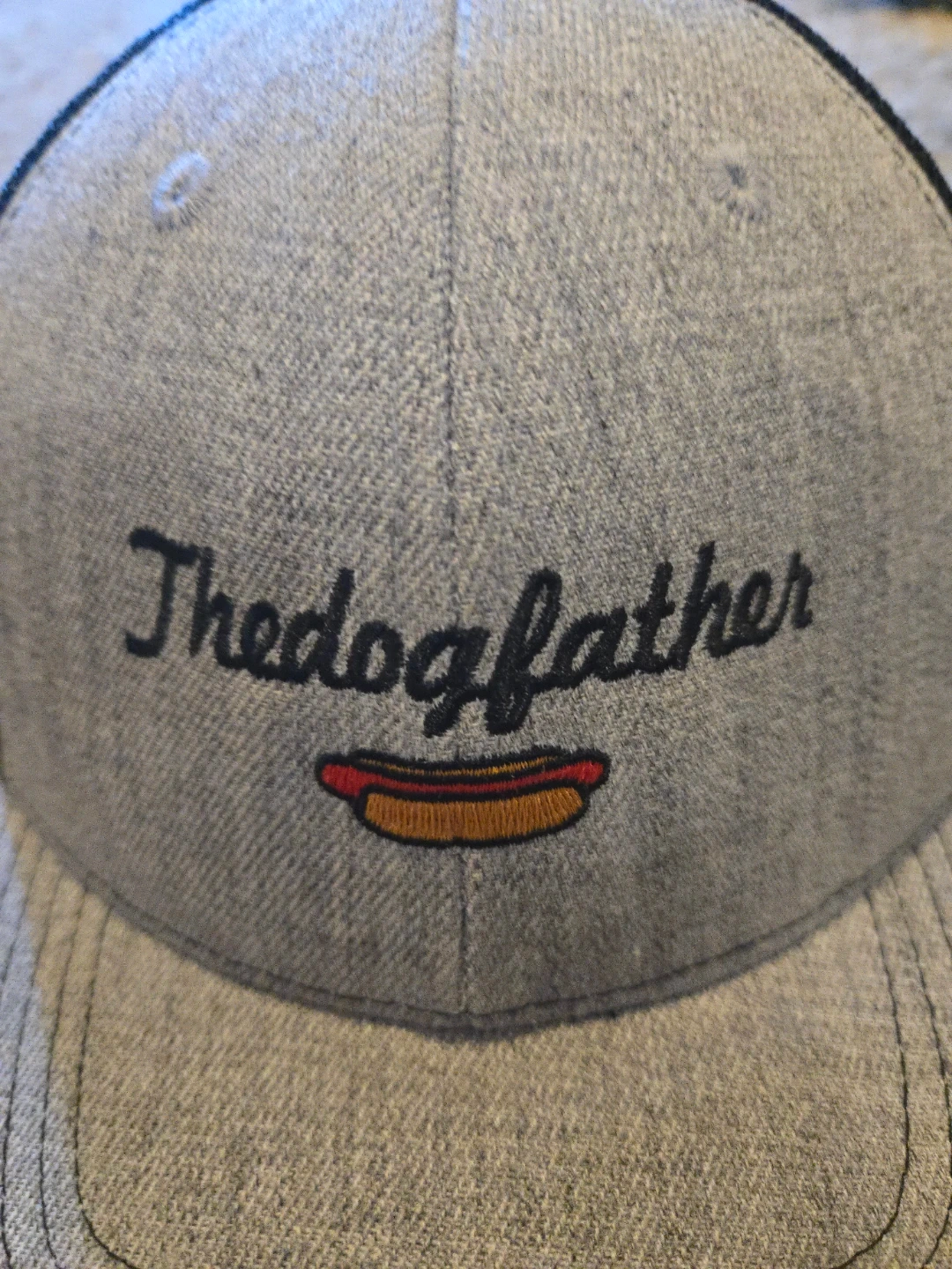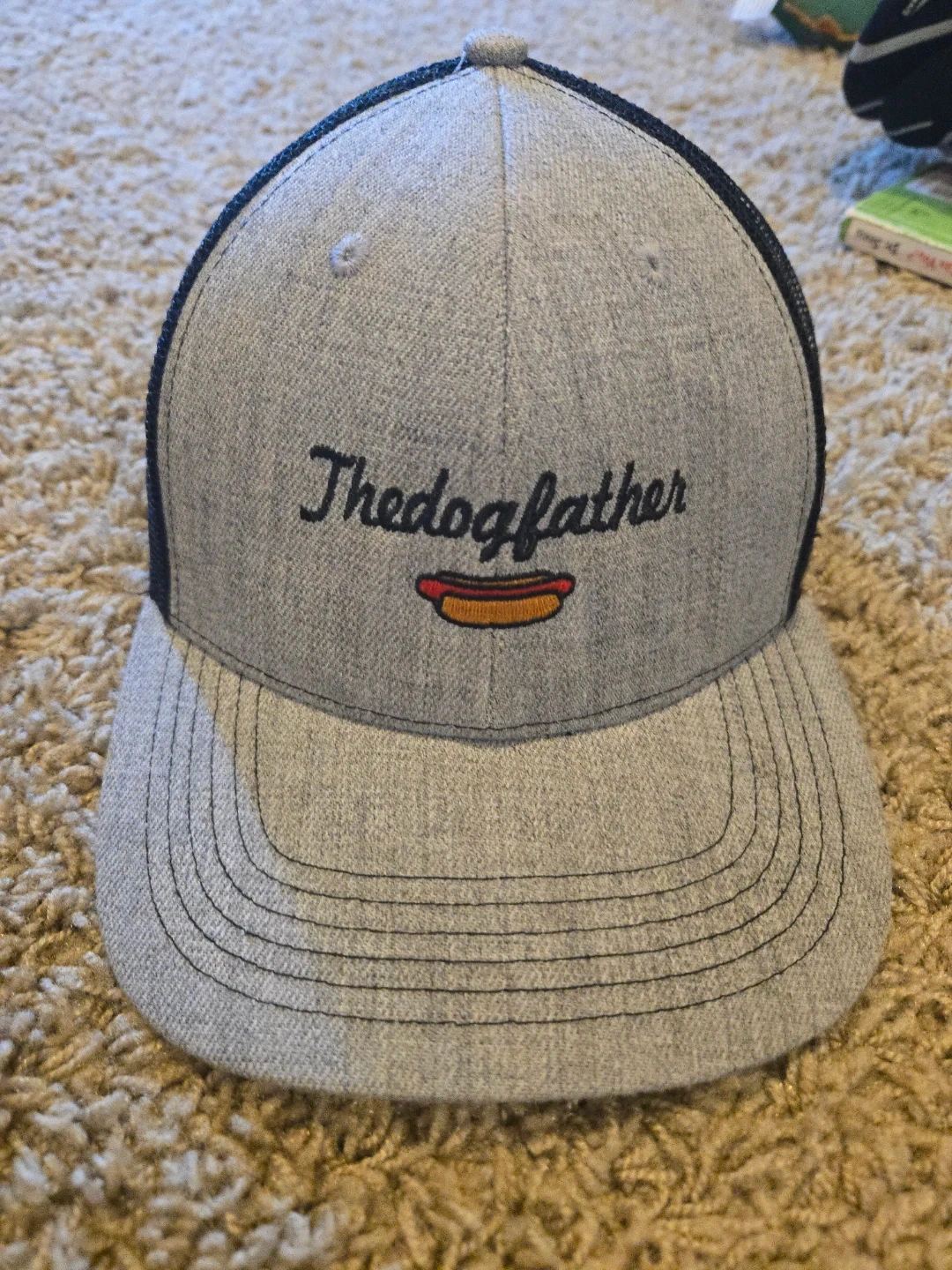 Grey and black trucker hat with "Thedogfather" embroidered on the front. Features a hot dog graphic below the text. It's a mesh back style.