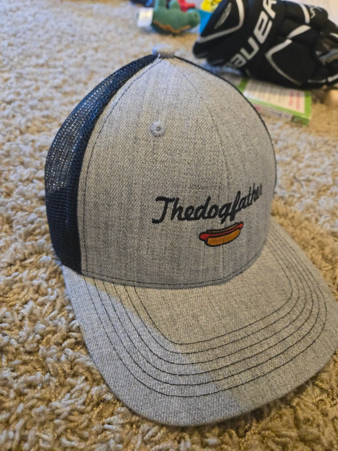 Grey and black trucker hat with "Thedogfather" embroidered on the front. Features a hot dog graphic below the text. It's a mesh back style.