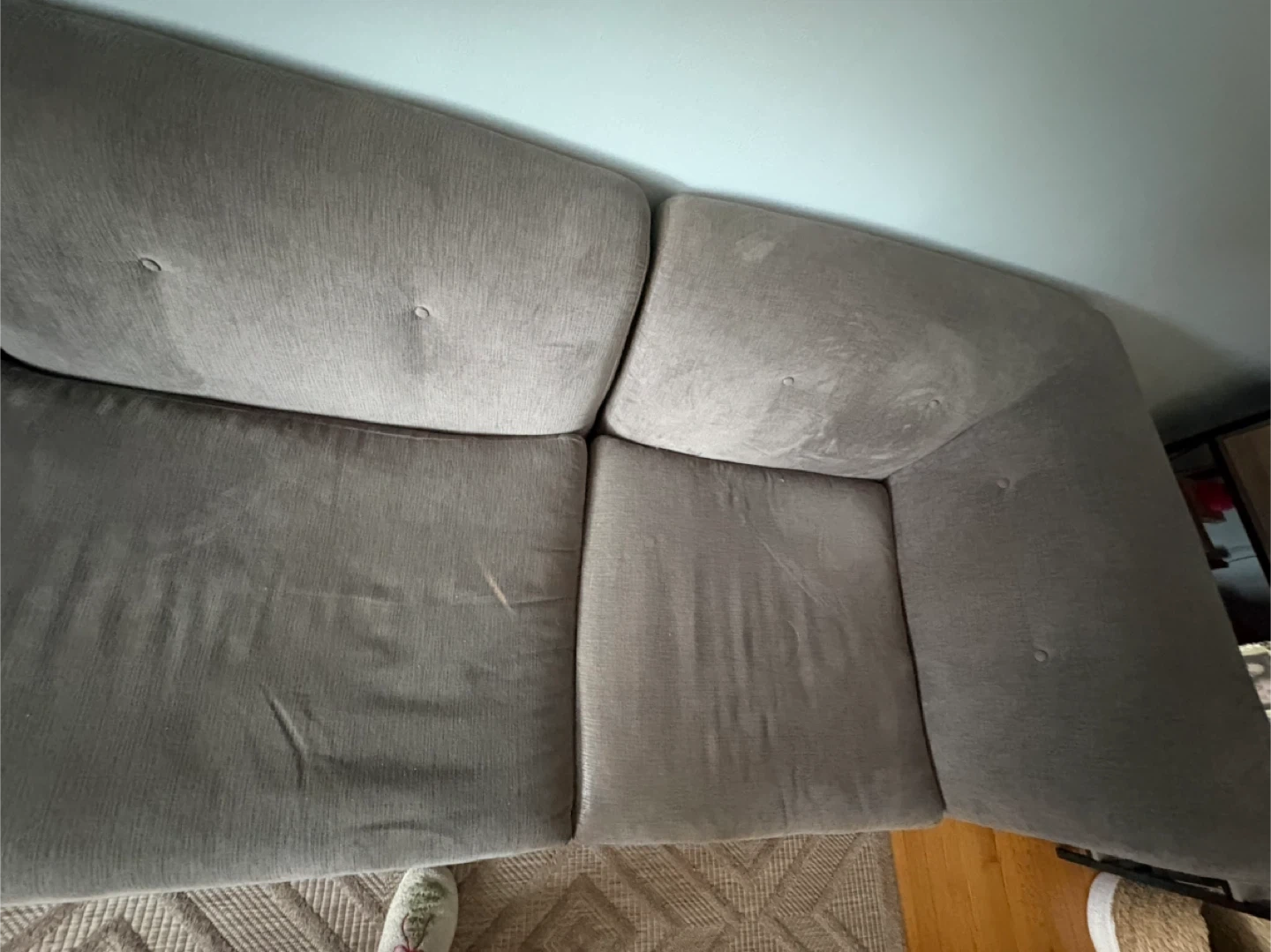 This sectional sofa offers ample seating space with its modular design. It's upholstered in a durable gray fabric. The sofa features comfortable cushions with tufting on the backrests. Perfect for large living areas or family rooms!
