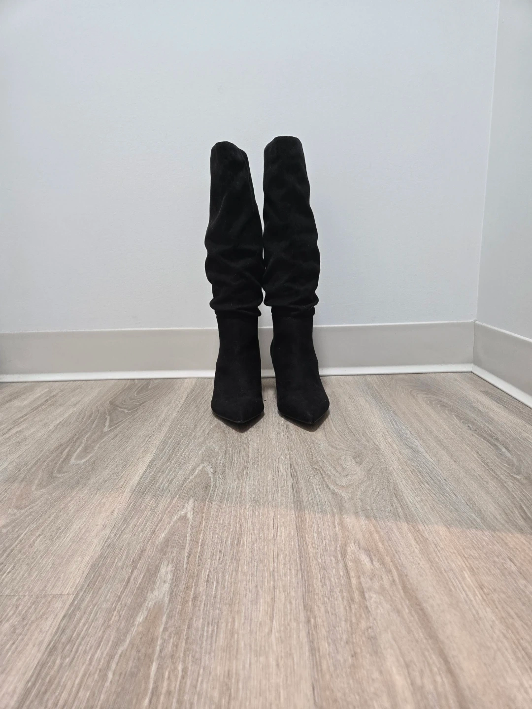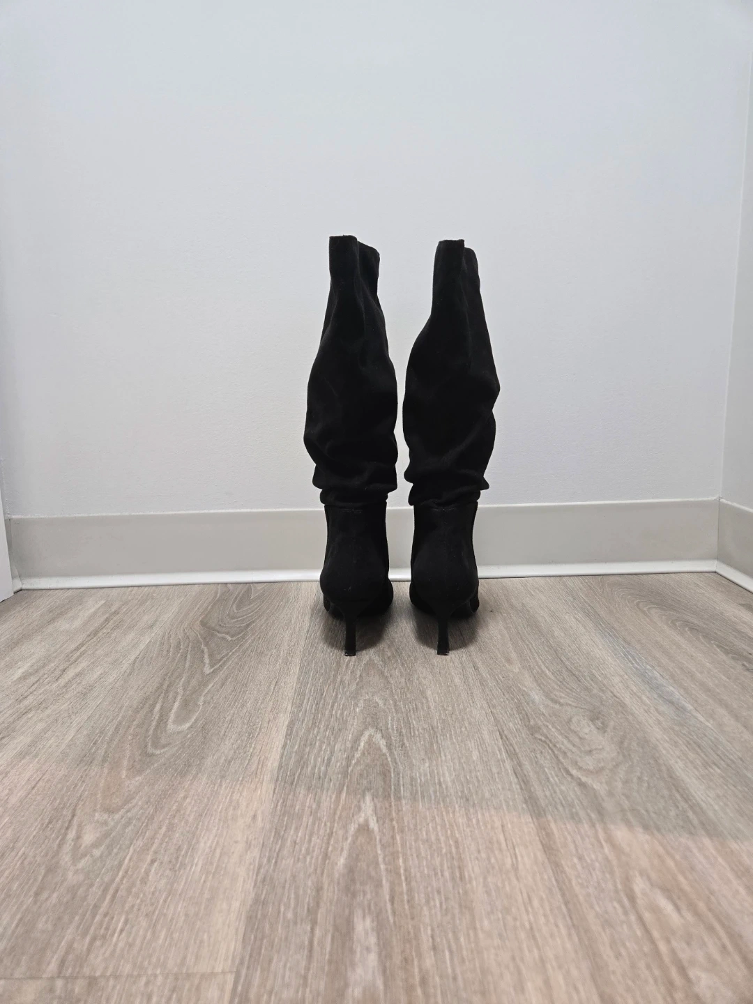 These black slouch boots are made from a suede-like material. They feature a pointed toe and a stiletto heel. A great addition for fall and winter outfits!