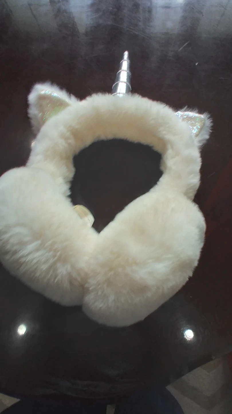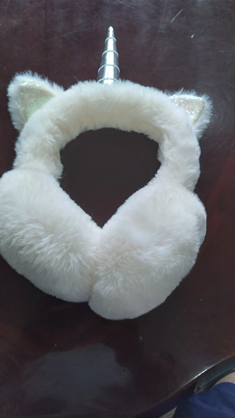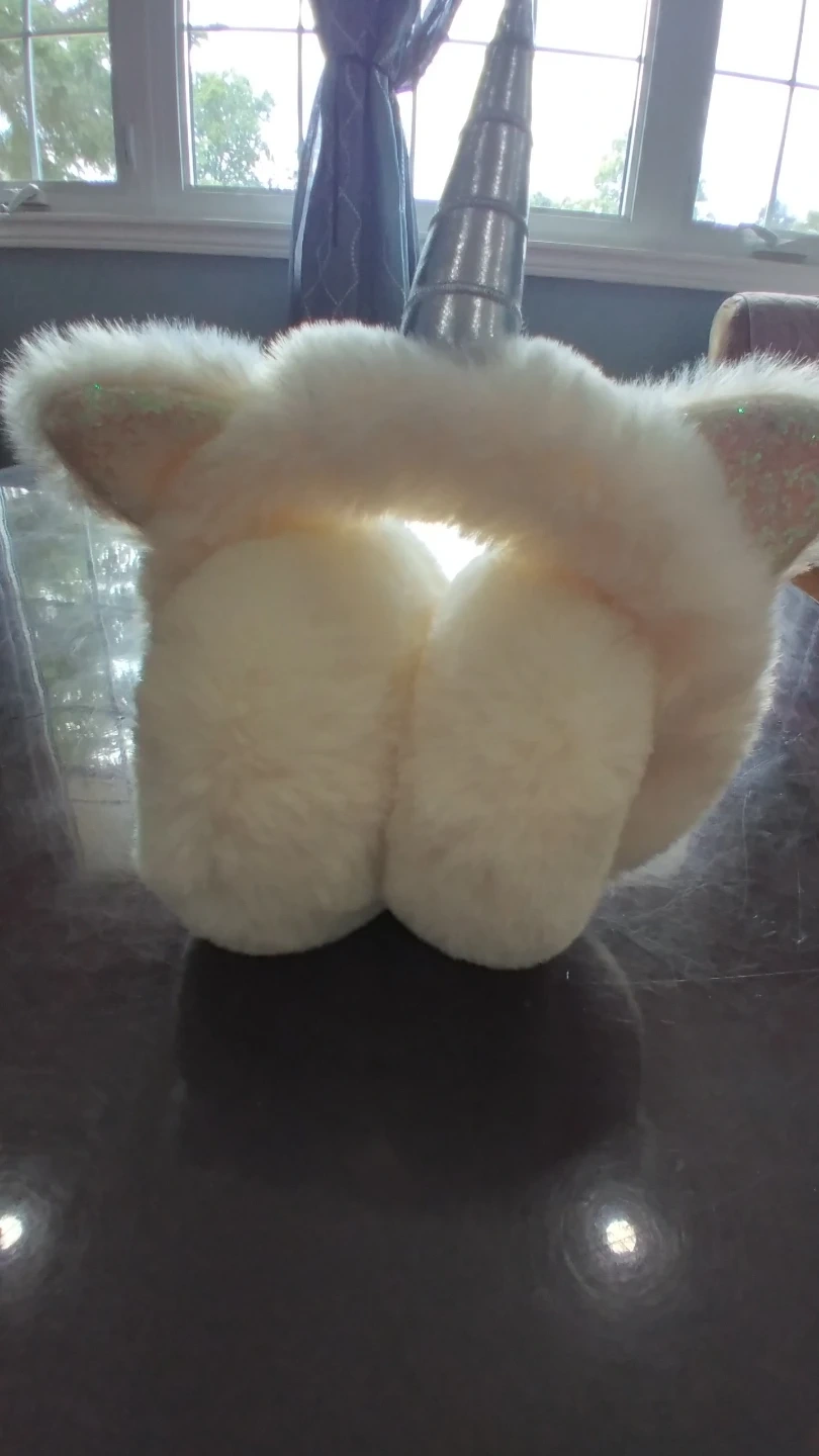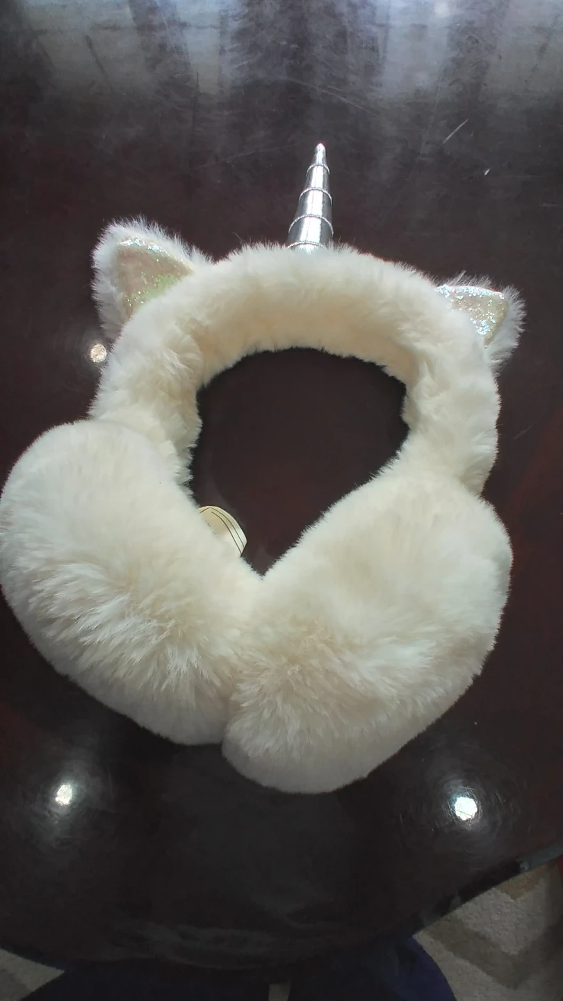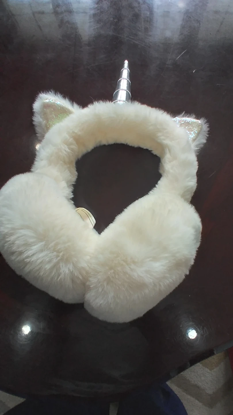 White fuzzy earmuffs with a silver unicorn horn and glittery unicorn ears. One size fits most. Keeps your ears toasty warm!