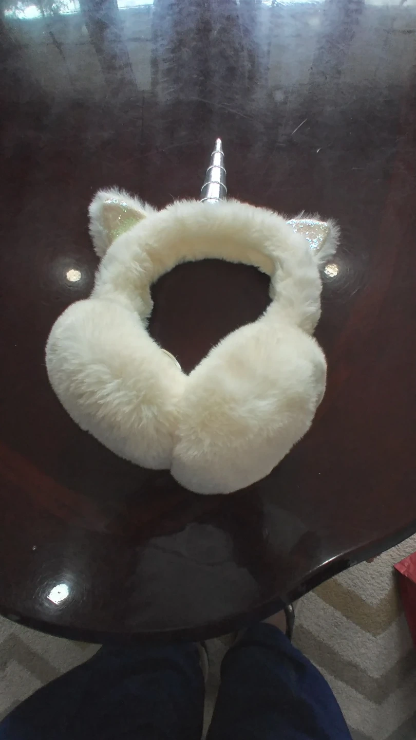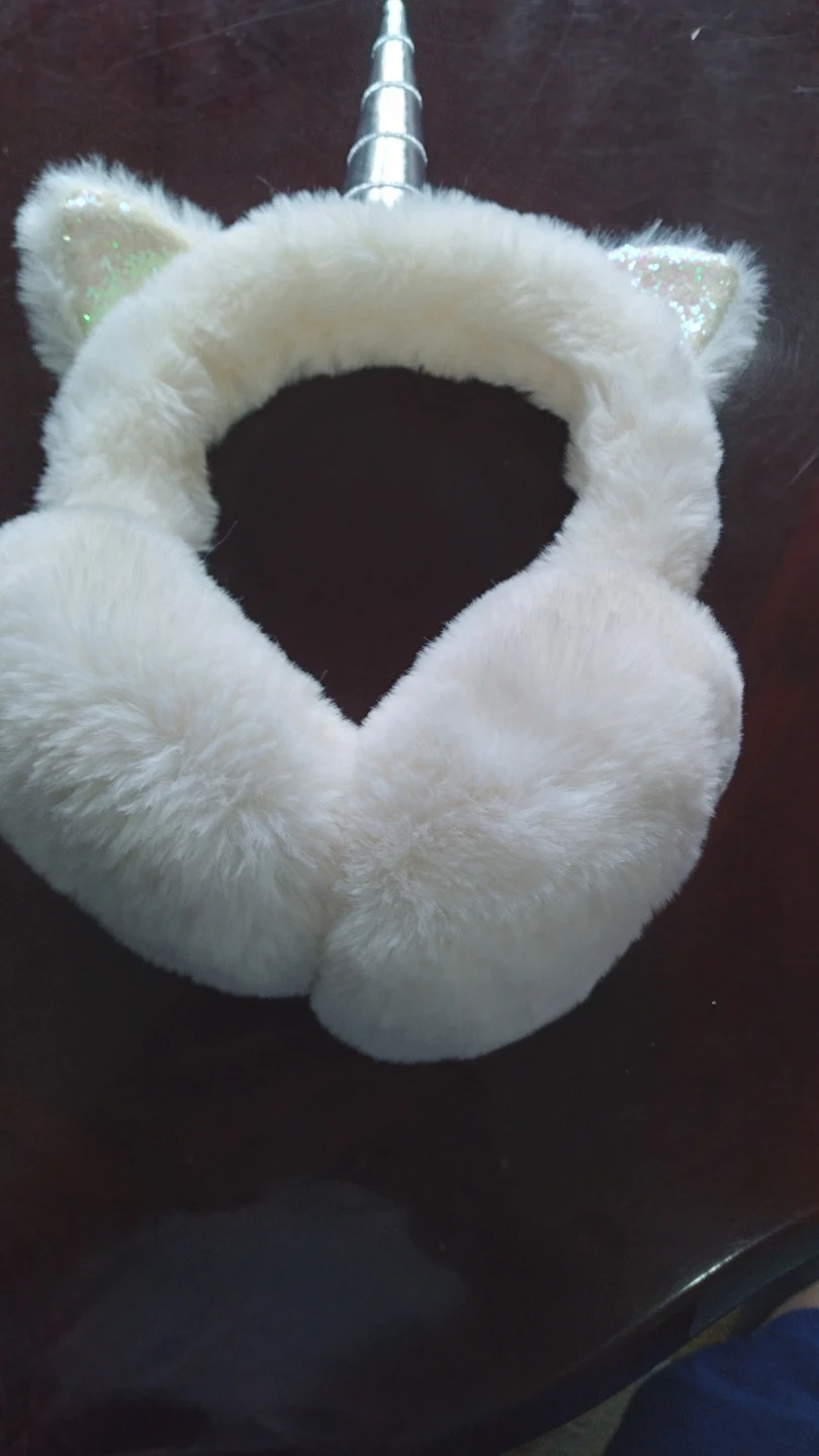 White fuzzy earmuffs with a silver unicorn horn and glittery unicorn ears. One size fits most. Keeps your ears toasty warm!