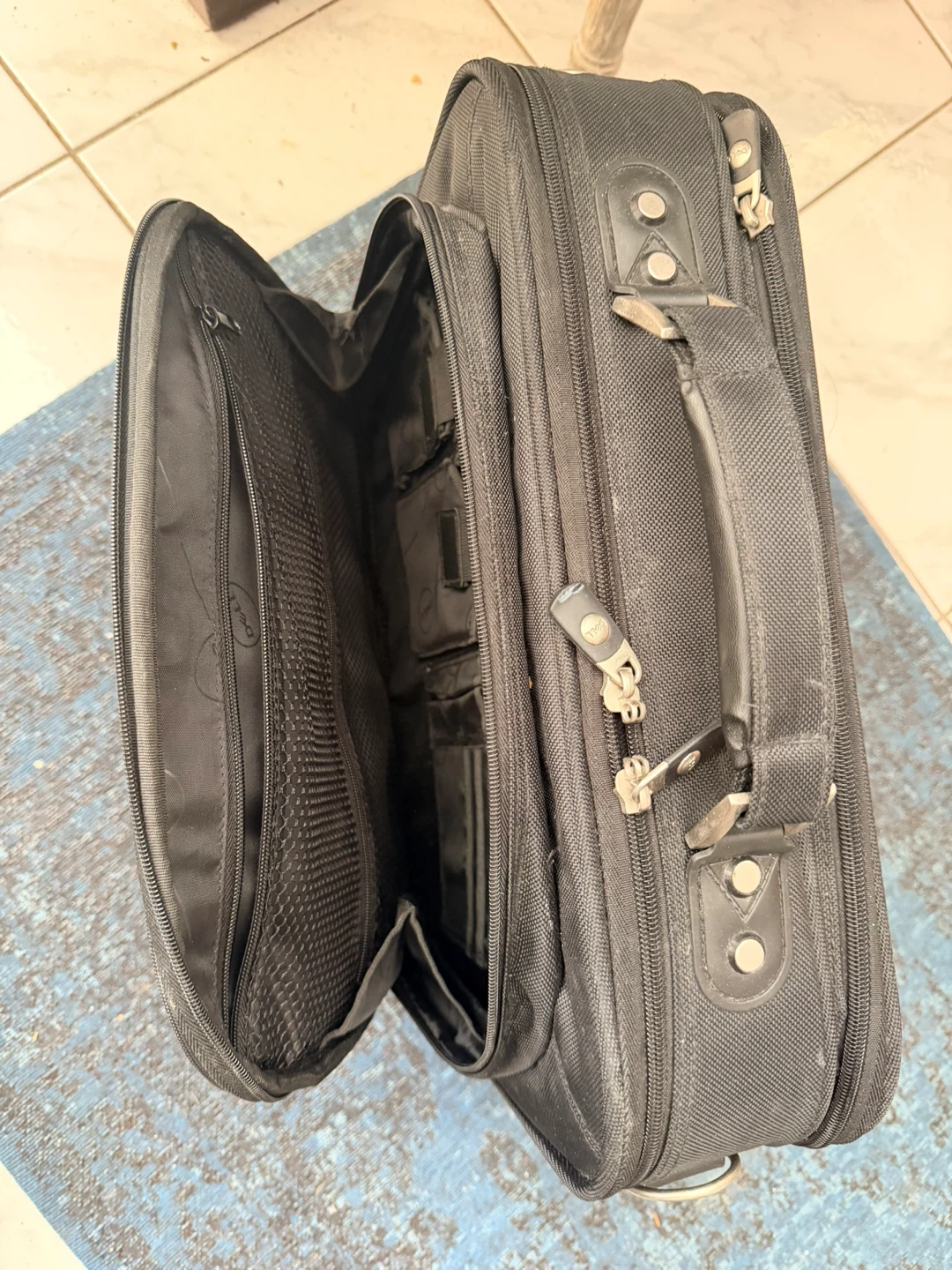 Dell black laptop bag with multiple compartments. It's made of durable nylon material. Perfect for carrying your laptop and accessories on the go!