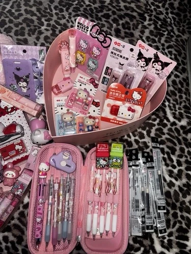 This cute stationery lot features popular characters from the Sanrio franchise such as Hello Kitty, My Melody, and Kuromi. The stationery items are colorful and made of materials like stainless steel, plastic, and acrylic, making them durable and long-lasting. Perfect for fans of Nippon Animation and Sanrio, this lot adds a touch of cuteness to any workspace or collection. Includes pen, mechanical, pencils, erasers, two mini stapler, two pencil boxes, ID lanyard.