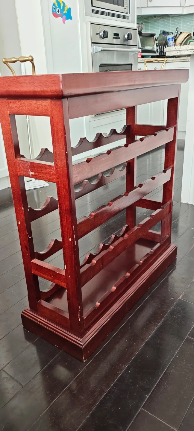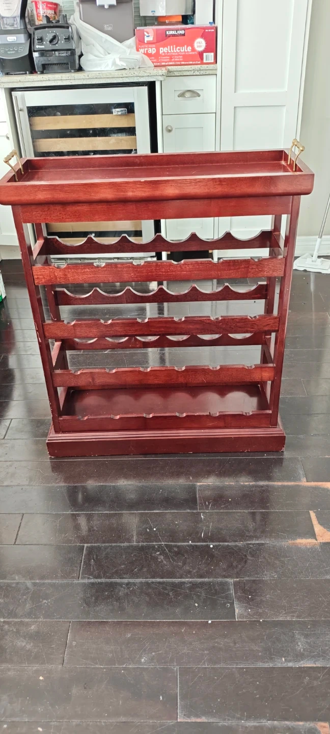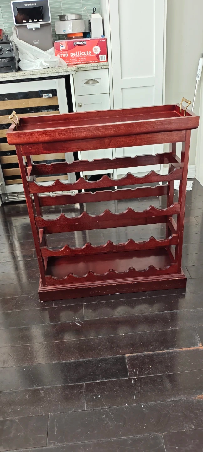 This is a dark red wooden wine rack with a tray top and two handles. It has five shelves designed to hold multiple bottles of wine, with a flat surface on the very top. It's perfect for storing your wine collection in a stylish way.