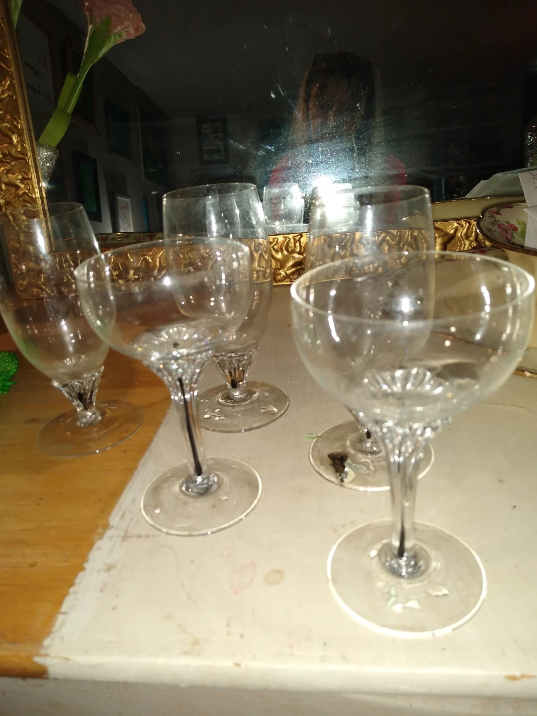 This is a set of five hand blown pieces of stemware from Czechoslovakia no longer made don't don't even longer have that country or company they are a rare fine to say the least and just exquisite they have iodine in the in the hand blown stems they're just lovely