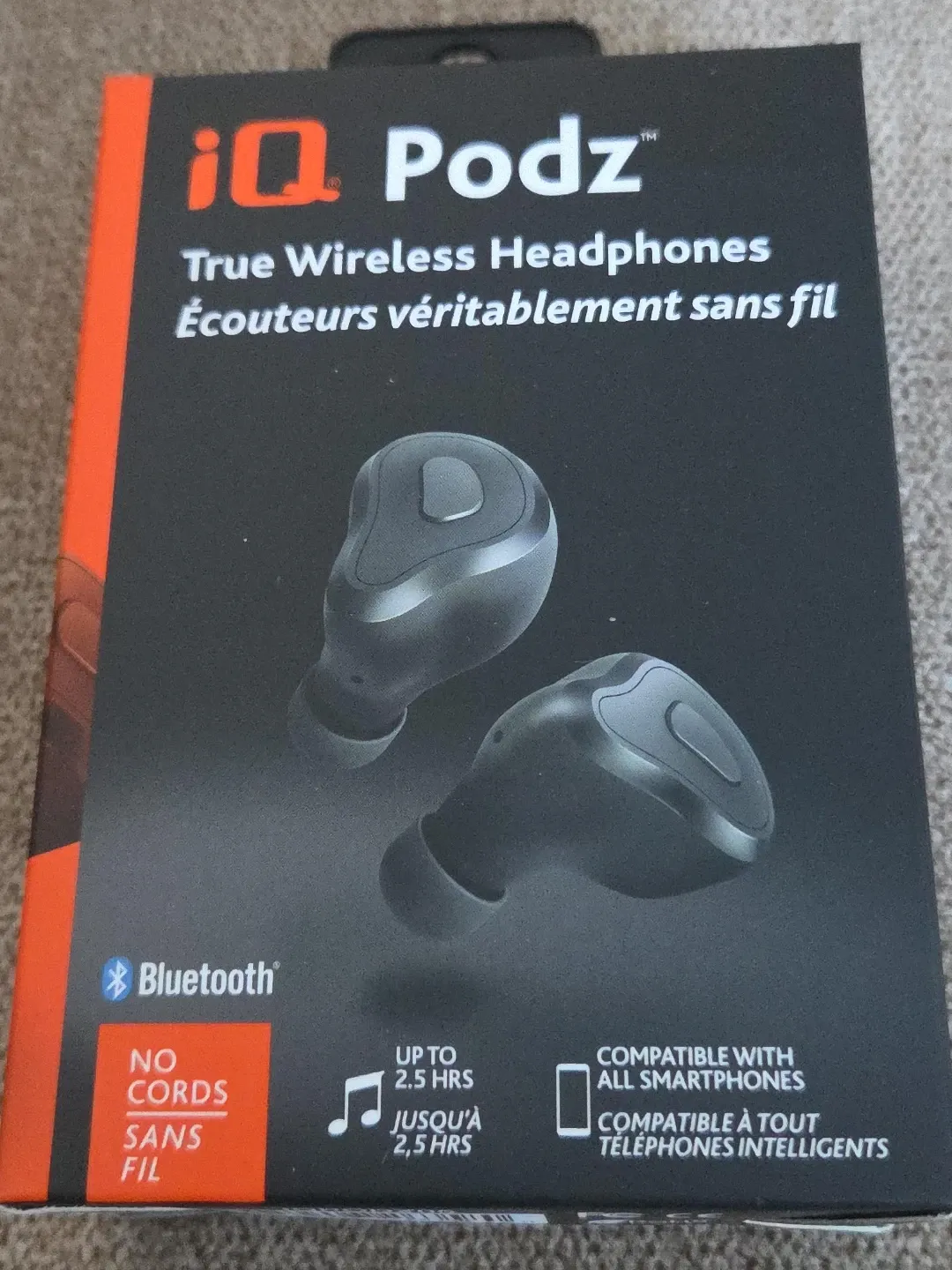 These are iQ Podz true wireless headphones. They connect via Bluetooth and are compatible with all smartphones. Battery life is up to 2.5 hours.