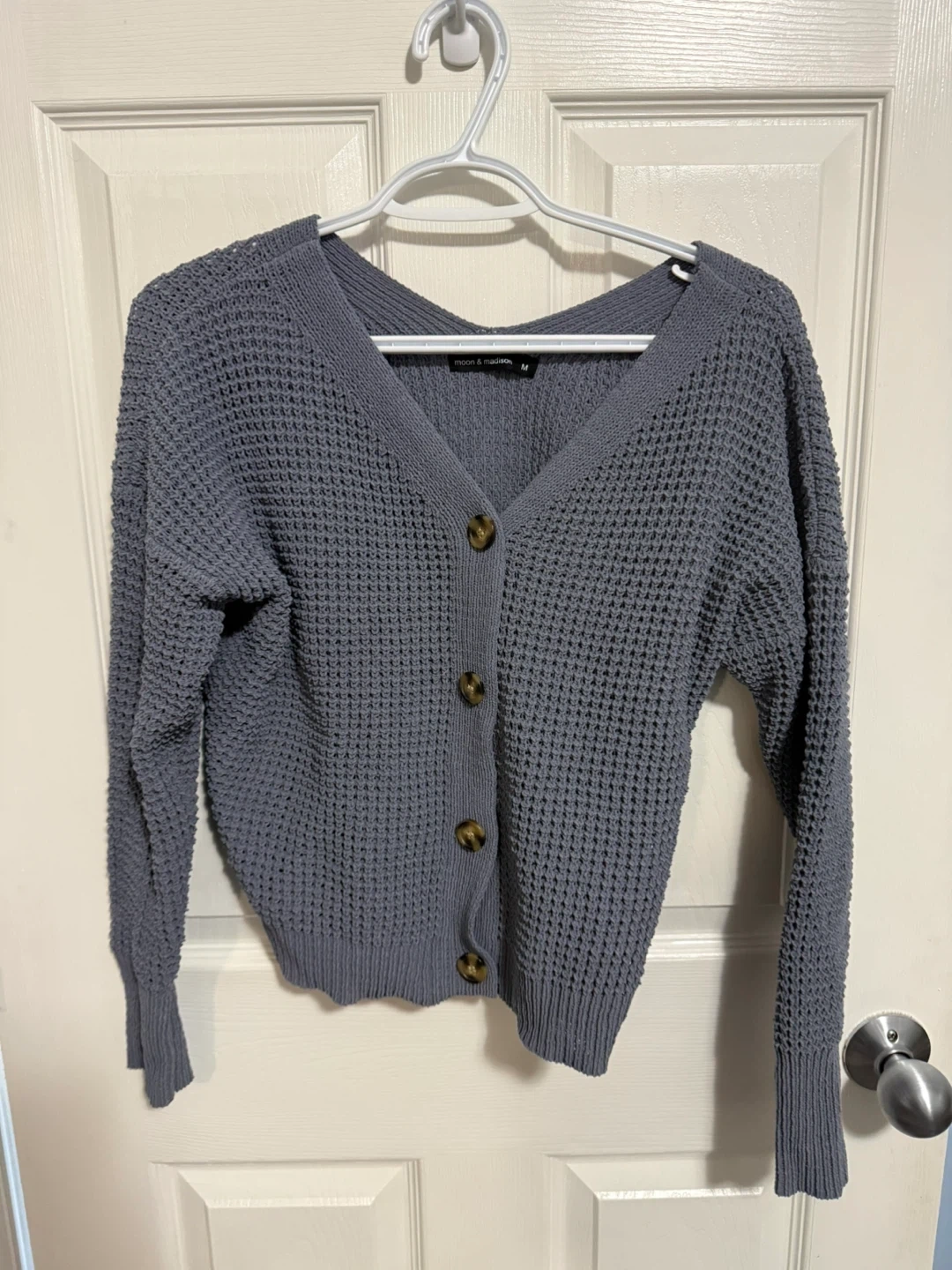Buy & SellButton-Up Cardigan SweaterButton-Up Cardigan Sweater$10The lighting is weird in second picture, but it presents more as first picture - Greyish, Blue. - Size medium Not worn much, isn’t my style anymore.ConditionLike newBrandMoon & MadisonWHERE TO MEETCheck LocationView MapSELLERverifiedJennaCentral Business District842 reviews0 chats·0 favorites·6 viewsSEND CHAT TO SELLERHi Jenna! I’m interested in your listing.Hi Jenna! I’m interested in your listing.Get the Karrot app to chatSign In to chat