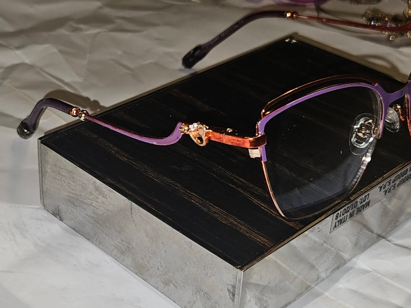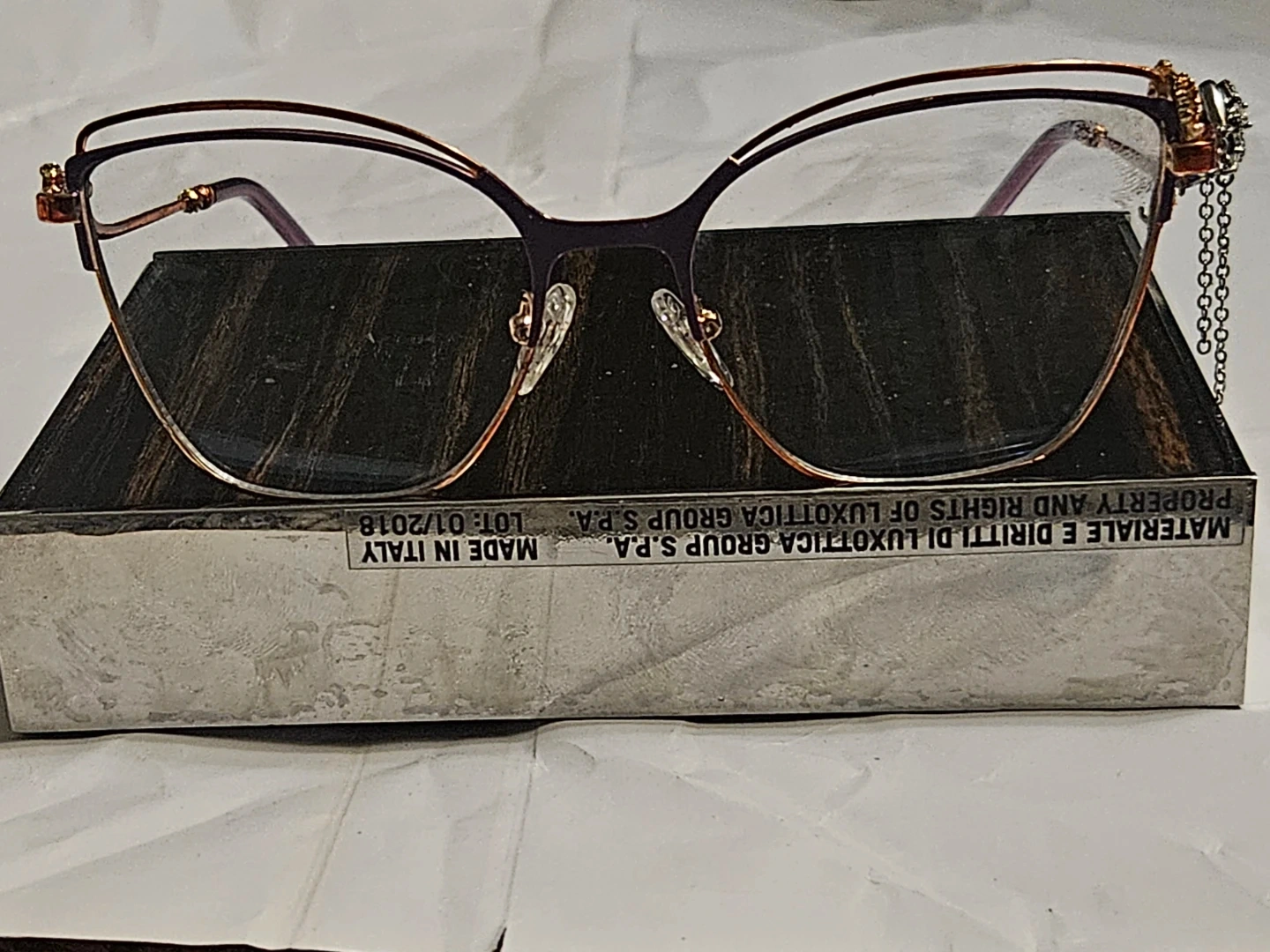Stylish eyeglasses with a unique cat-eye shape and a decorative rhinestone charm on the temple. The frames are a lovely combination of purple and rose gold. Made in Italy.
