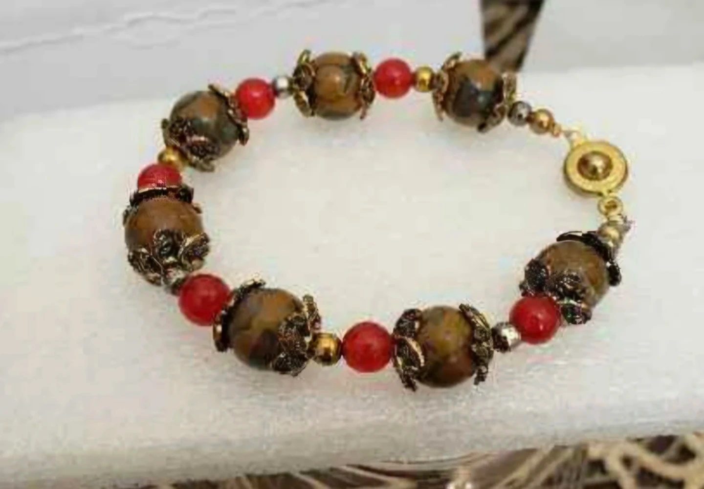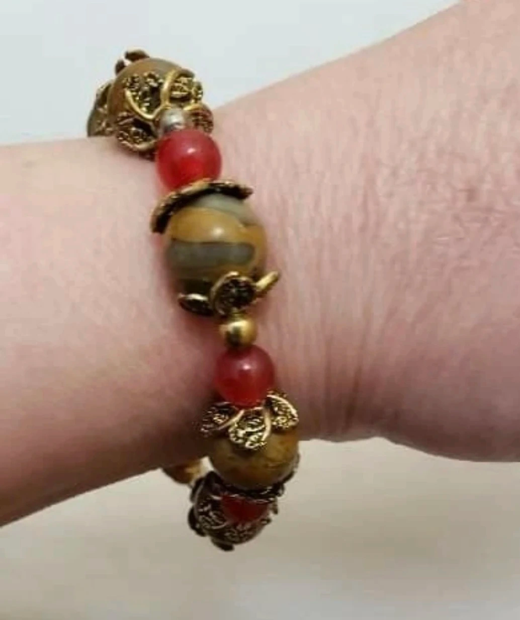 This bracelet features a mix of stone beads and red accent beads. It's finished with ornate metal findings. This piece adds a unique touch to any outfit!