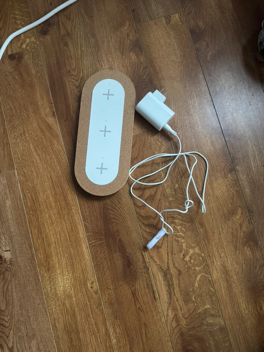 This oval-shaped wireless charging pad has three marked charging zones. It's made with a cork base and a white top. A white power adapter and cable are included. This charger is great for powering up multiple devices at once!