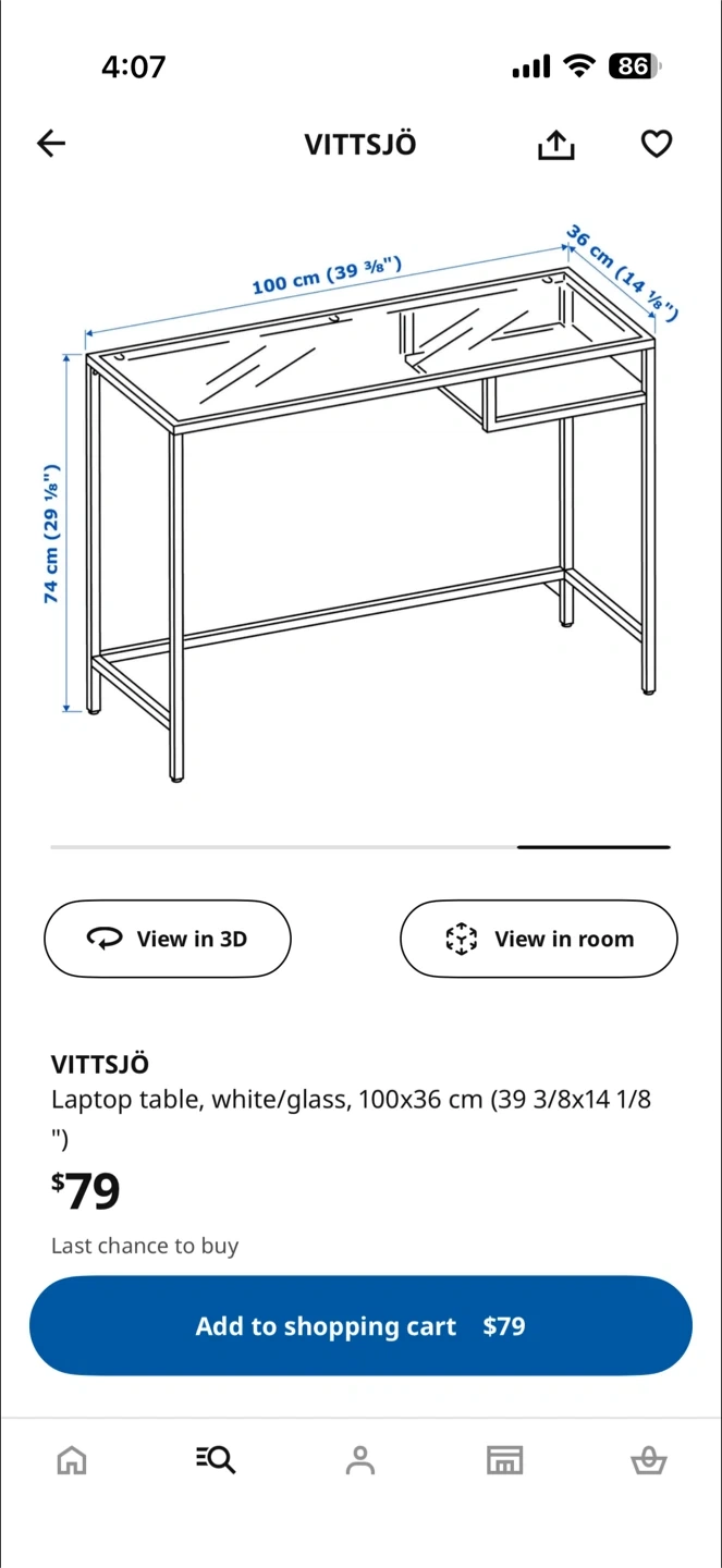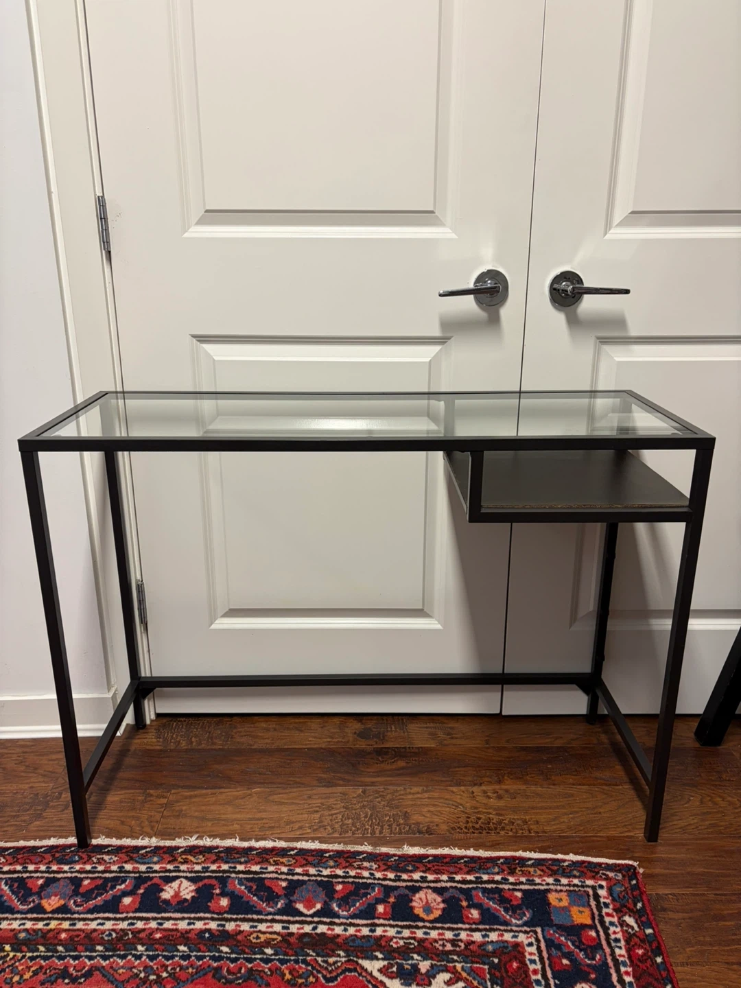 Selling an IKEA VITTSJÖ laptop table in black with a glass top. It's in great shape and would be perfect for a small workspace. The dimensions are 100x36 cm (39 3/8x14 1/8 ")