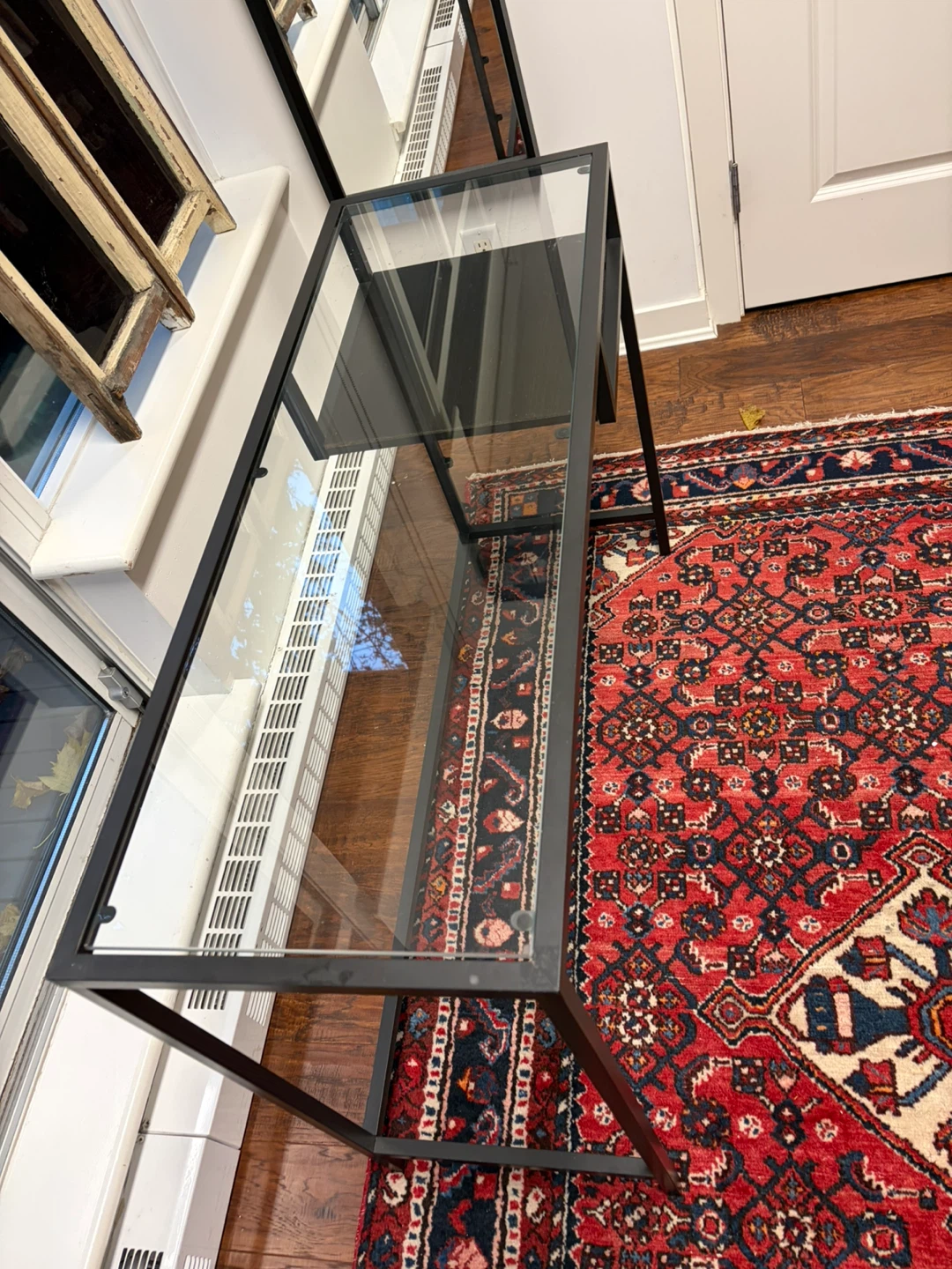 Selling an IKEA VITTSJÖ laptop table in black with a glass top. It's in great shape and would be perfect for a small workspace. The dimensions are 100x36 cm (39 3/8x14 1/8 ")